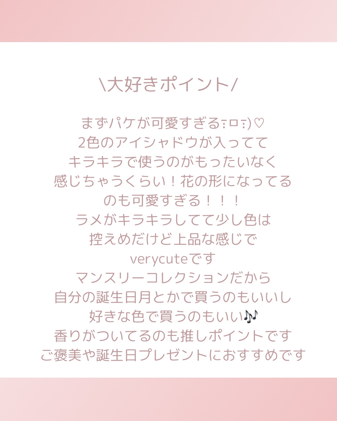 | アイシャドウパレットランキング第10位 | 生で見た時の破壊力!!! 繊細なラメも色味もド真ん中に直球なタイプすぎました💞 | 詳細を見る | |