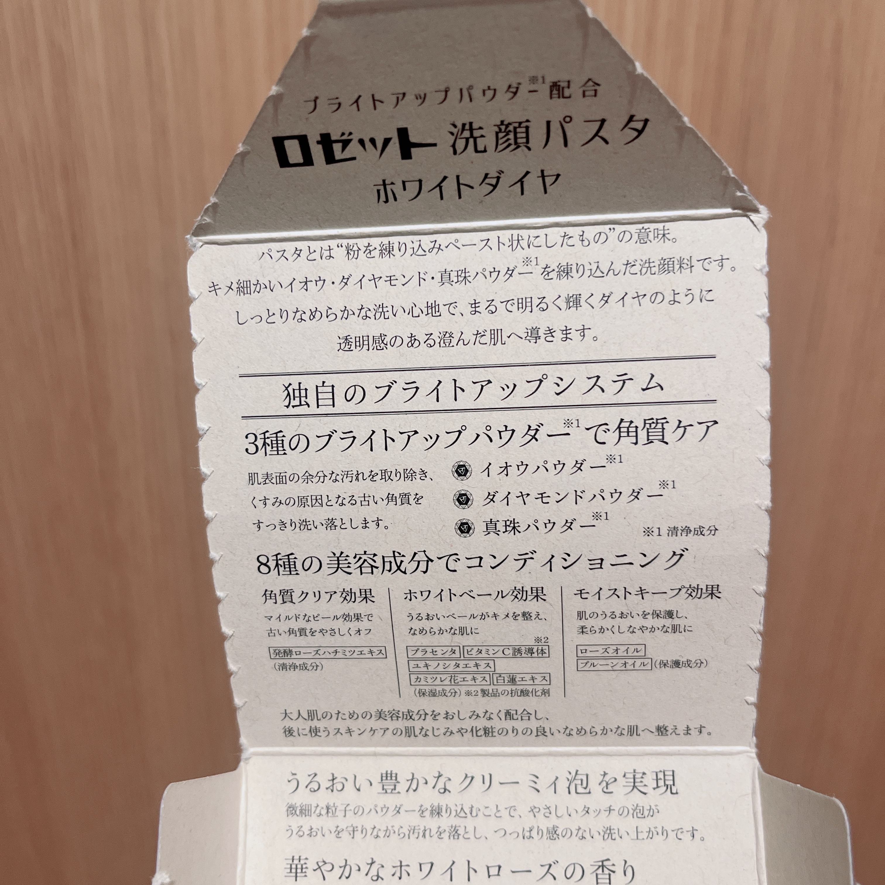 - <ロゼット洗顔パスタ ホワイトダイヤ> 水、ミリスチン酸、ステアリン酸、グリセリン、パルミチン酸、水酸化K、ジグリセリン、ラウリン酸、ラウラミドDEA、メチルグルセス-10、コカミドプロピルベタイン、ラウロイルメチルタウリンNa、イオウ、ダイヤモンド末、パール、グルコノバクター/ハチミツ発酵液、プラセンタエキス、アスコルビン酸硫酸2Na、ユキノシタエキス、カミツレ花エキス、乳酸桿菌/ハス種子発酵液、ダマスクバラ花油、プルーン種子油、BG、コレステロール、ヤシ脂肪酸K、ココイルグリシンK、ステアリン酸PEG-45、セテス-25、トリセテス-5リン酸、ステアリン酸グリセリル(SE)、ヒドロキシプロピルデンプン、(ジフェニルジメチコン/ビニルジフェニルジメチコン/シルセスキオキサン)クロスポリマー、亜硫酸Na、EDTA-4Na、香料