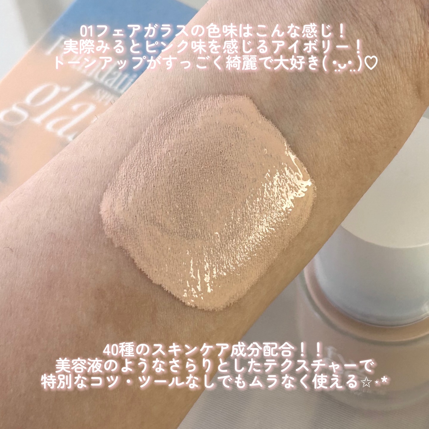 - <01 フェアガラス> 温泉水、酸化チタン (CI 77891)、シクロペンタシロキサン、メトキシケイヒ酸エチルヘキシル、サリチル酸エチルヘキシル、ラウリルPEG-9ポリジメチルシロキシエチルジメチコン、イソドデカン、グリセリン、プロパンジオール、ジフェニルシロキシフェニルトリメチコン、ジ(カプリル/カプリン酸)BG、ナイアシンアミド、1,2-ヘキサンジオール、トリメチルシロキシケイ酸、キシリトール、シラカンバ樹液、ツルマンネングサエキス、ルリジサエキス、ヤグルマギク花エキス、カミツレ花/葉エキス、ヒアシンスエキス、ラベンダー花水、オニサルビアエキス、ラベンダーエキス、ハナハッカ花/葉/茎エキス、ローズマリーエキス、タイムエキス、ヒアルロン酸Na、アップルミント葉エキス、チャ葉エキス発酵液、タチジャコウソウ葉エキス、加水分解ヒアルロン酸、ヒアルロン酸、メチルトリメチコン、PEG-10ジメチコン、トリメリト酸トリトリデシル、ジメチコン、ジステアルジモニウムヘクトライト、(アクリレーツ/アクリル酸ステアリル/メタクリル酸ジメチコン)コポリマー、硫酸Mg、(ジメチコン/ビニルジメチコン)クロスポリマー、合成フルオロフロゴパイト、ポリグリセリル-3ポリジメチルシロキシエチルジメチコン、ポリヒドロキシステアリン酸、ステアリン酸、水酸化Al、アルミナ、トリエトキシカプリリルシラン、オクチルドデカノール、カプリリルグリコール、水、パルミチン酸エチルヘキシル、ミリスチン酸イソプロピル、イソステアリン酸、レシチン、PEG-9ポリジメチルシロキシエチルジメチコン、アデノシン、エチレンジアミンジコハク酸3Na、ポリリシノレイン酸ポリグリセリル-3、ジエチルヘキサン酸ネオペンチルグリコール、イソステアリン酸ポリグリセリル-4、ポリプロピルシルセスキオキサン、トリイソステアリン酸イソプロピルチタン、トコフェロール、トリ(カプリル/カプリン酸)グリセリル、トレハロース、BG、水添レシチン、セラミドNP、グリシン、セリン、グルタミン酸、塩化Na、アスパラギン酸、ロイシン、アラニン、リシン、アルギニン、チロシン、フェニルアラニン、カプリル酸グリセリル、プロリン、トレオニン、バリン、イソロイシン、エチルヘキシルグリセリン、ヒスチジン、システイン、メチオニン、ヒアルロン酸ヒドロキシプロピルトリモニウム、ステアロイルグルタミン酸Na、炭酸水素Na、塩化Ca、塩化K、アセチルヒアルロン酸Na、加水分解ヒアルロン酸Na、ヒアルロン酸クロスポリマーNa、ヒアルロン酸K、香料、酸化鉄 <02 ピーチガラス> 温泉水、酸化チタン (CI 77891)、シクロペンタシロキサン、メトキシケイヒ酸エチルヘキシル、サリチル酸エチルヘキシル、ラウリルPEG-9ポリジメチルシロキシエチルジメチコン、イソドデカン、グリセリン、プロパンジオール、ジフェニルシロキシフェニルトリメチコン、ジ(カプリル/カプリン酸)BG、ナイアシンアミド、1,2-ヘキサンジオール、トリメチルシロキシケイ酸、酸化鉄、キシリトール、シラカンバ樹液、ツルマンネングサエキス、ルリジサエキス、ヤグルマギク花エキス、カミツレ花/葉エキス、ヒアシンスエキス、ラベンダー花水、オニサルビアエキス、ラベンダーエキス、ハナハッカ花/葉/茎エキス、ローズマリーエキス、タイムエキス、ヒアルロン酸Na、アップルミント葉エキス、チャ葉エキス発酵液、タチジャコウソウ葉エキス、加水分解ヒアルロン酸、ヒアルロン酸、メチルトリメチコン、PEG-10ジメチコン、トリメリト酸トリトリデシル、ジメチコン、ジステアルジモニウムヘクトライト、(アクリレーツ/アクリル酸ステアリル/メタクリル酸ジメチコン)コポリマー、硫酸Mg、(ジメチコン/ビニルジメチコン)クロスポリマー、合成フルオロフロゴパイト、ポリグリセリル-3ポリジメチルシロキシエチルジメチコン、ポリヒドロキシステアリン酸、ステアリン酸、水酸化Al、アルミナ、トリエトキシカプリリルシラン、オクチルドデカノール、カプリリルグリコール、PEG-9ポリジメチルシロキシエチルジメチコン、水、パルミチン酸エチルヘキシル、ミリスチン酸イソプロピル、イソステアリン酸、レシチン、アデノシン、エチレンジアミンジコハク酸3Na、ポリリシノレイン酸ポリグリセリル-3、ポリプロピルシルセスキオキサン、ジエチルヘキサン酸ネオペンチルグリコール、イソステアリン酸ポリグリセリル-4、トリイソステアリン酸イソプロピルチタン、トコフェロール、トリ(カプリル/カプリン酸)グリセリル、トレハロース、BG、水添レシチン、セラミドNP、グリシン、セリン、グルタミン酸、塩化Na、アスパラギン酸、ロイシン、アラニン、リシン、アルギニン、チロシン、フェニルアラニン、カプリル酸グリセリル、プロリン、トレオニン、バリン、イソロイシン、エチルヘキシルグリセリン、ヒスチジン、システイン、メチオニン、ヒアルロン酸ヒドロキシプロピルトリモニウム、ステアロイルグルタミン酸Na、炭酸水