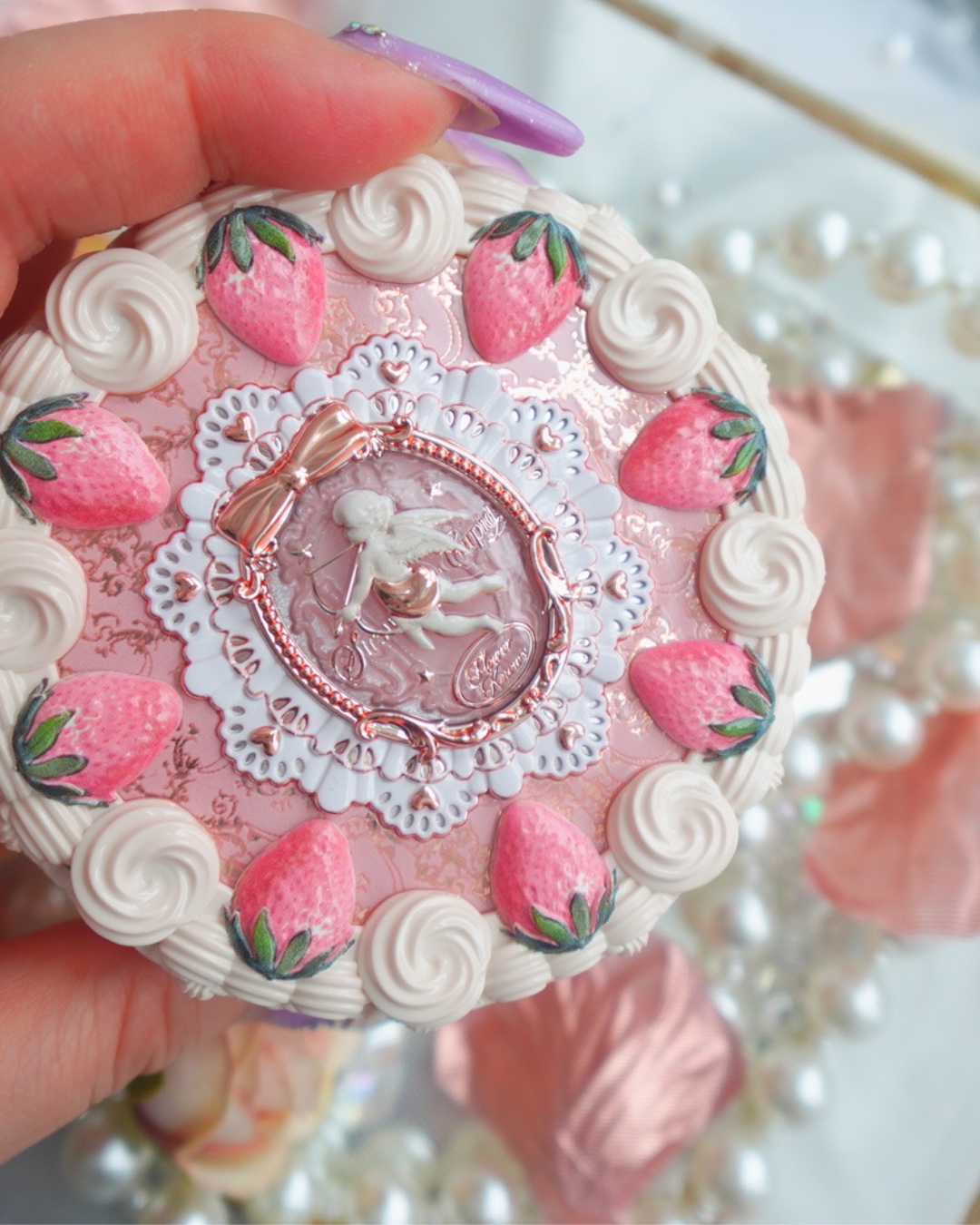 - 肌を美しく整えながら、心をときめかせるデザインと実用性を兼ね備えたパウダー 「ストロベリーミルクケーキ」をインスピレーションに、ミルクホイップの花が 円を描きながらストロベリーの浮き彫りを包み込み、金属感のある金色の花びらと 蝶結びのデザインが優雅さを際立たせています。 ロココ調のロマンチックさと豪華さを融合させたデザインで、特別な魅力を演出します。 ・微粒子パウダーで均一な仕上がり 毛穴や肌の凹凸をカバーし、なめらかで自然な肌を演出します。 軽やかなつけ心地で、一日中快適に。 ・持ち運びに便利なコンパクト設計 スリムなサイズでバッグにもすっきり収まり、外出先でも簡単にお直し可能。 ・デザイン性 スイーツをイメージしたイチゴとホイップクリームの装飾が施され、特別感を演出。 天使モチーフのパッケージが高級感と可愛らしさを兼ね備えています。