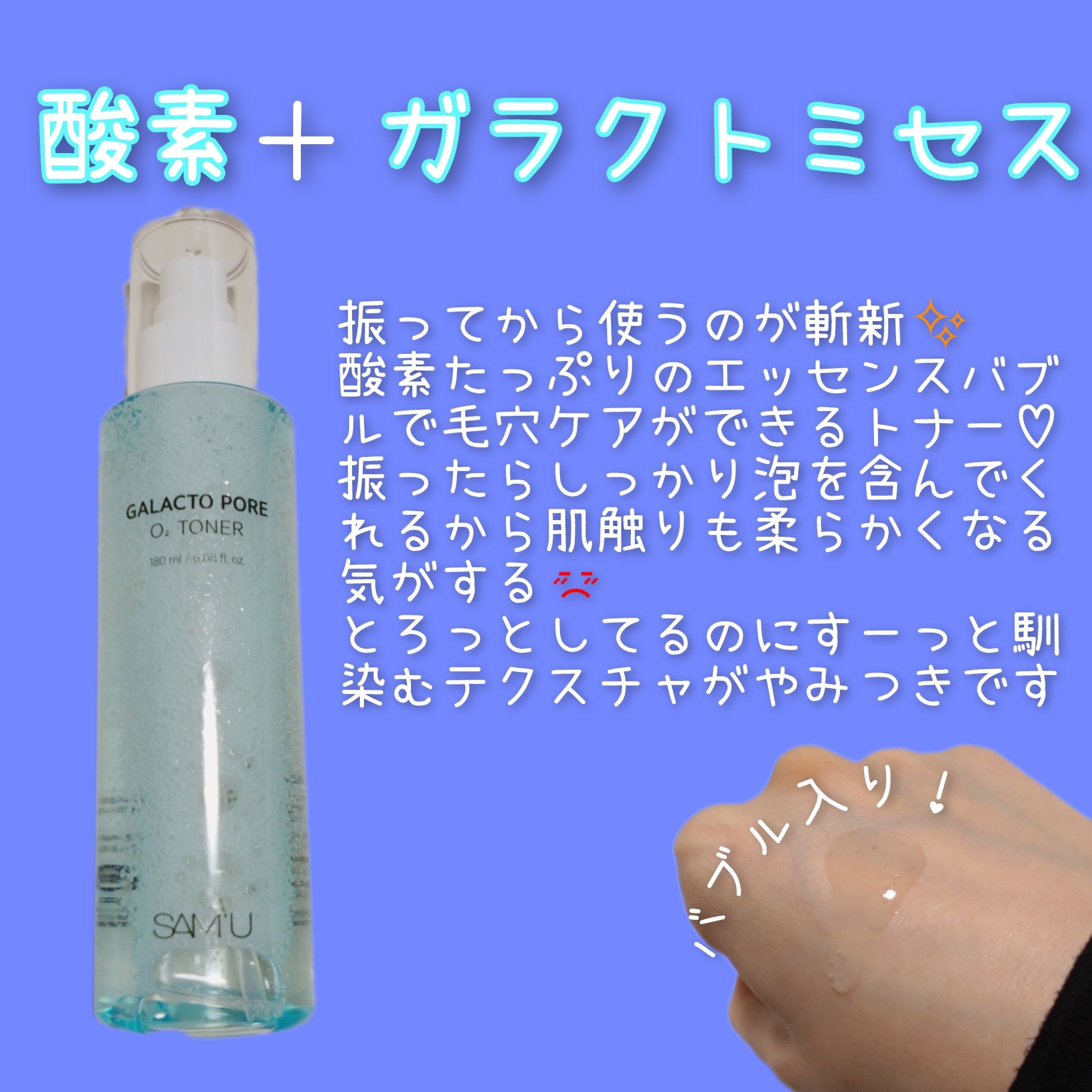 #PR#samu#サミュ#商品提供◆SAM'U◇ガラクトポアO₂トナー◌◍⿻*.·使用する前に振るトナーで振るとうまれる酸素を含んだエッセンスバブル🫧毛穴の中の皮脂・老廃物までしっかりオフ!ほんとに少しとろみのあるテクスチャすっと肌に馴染んで...