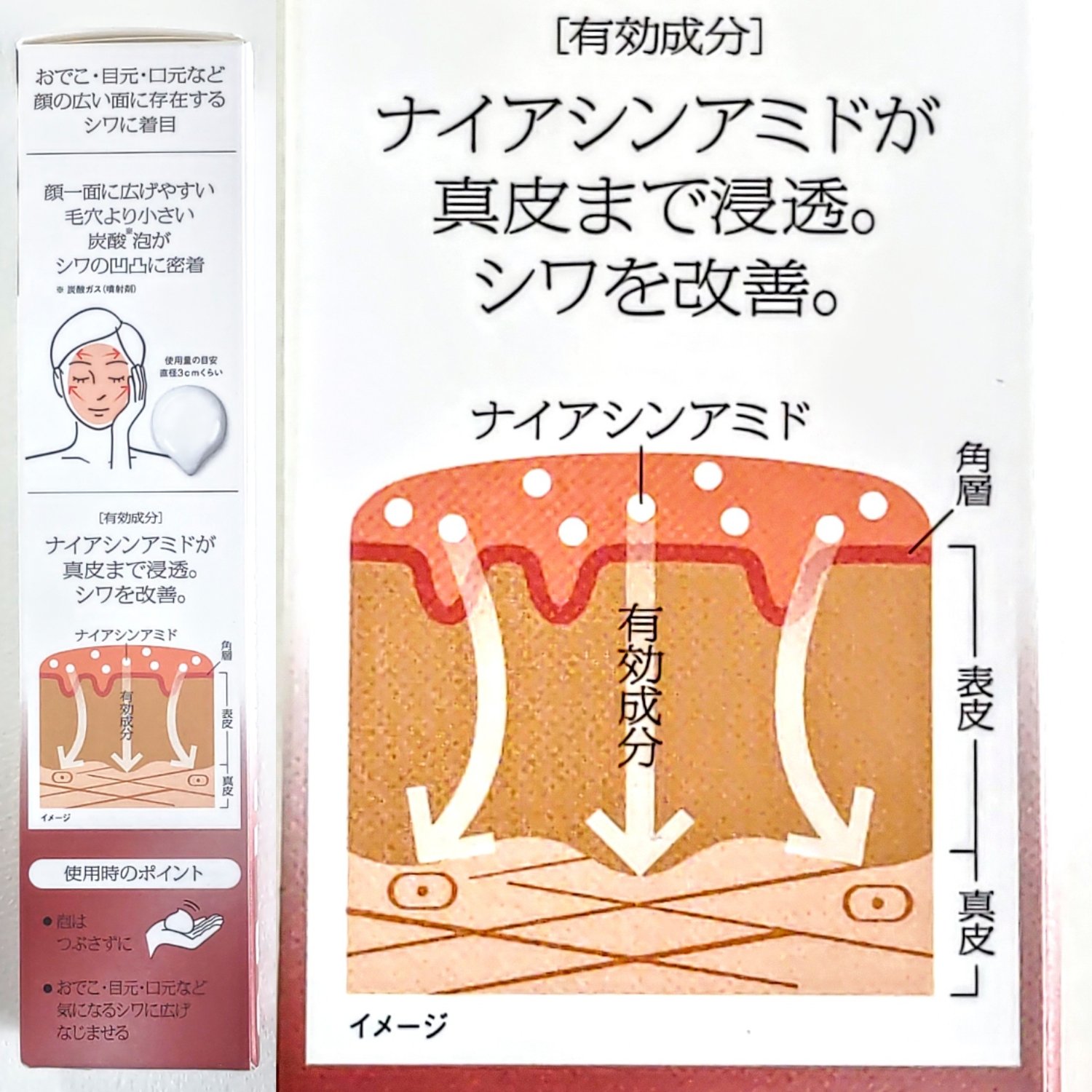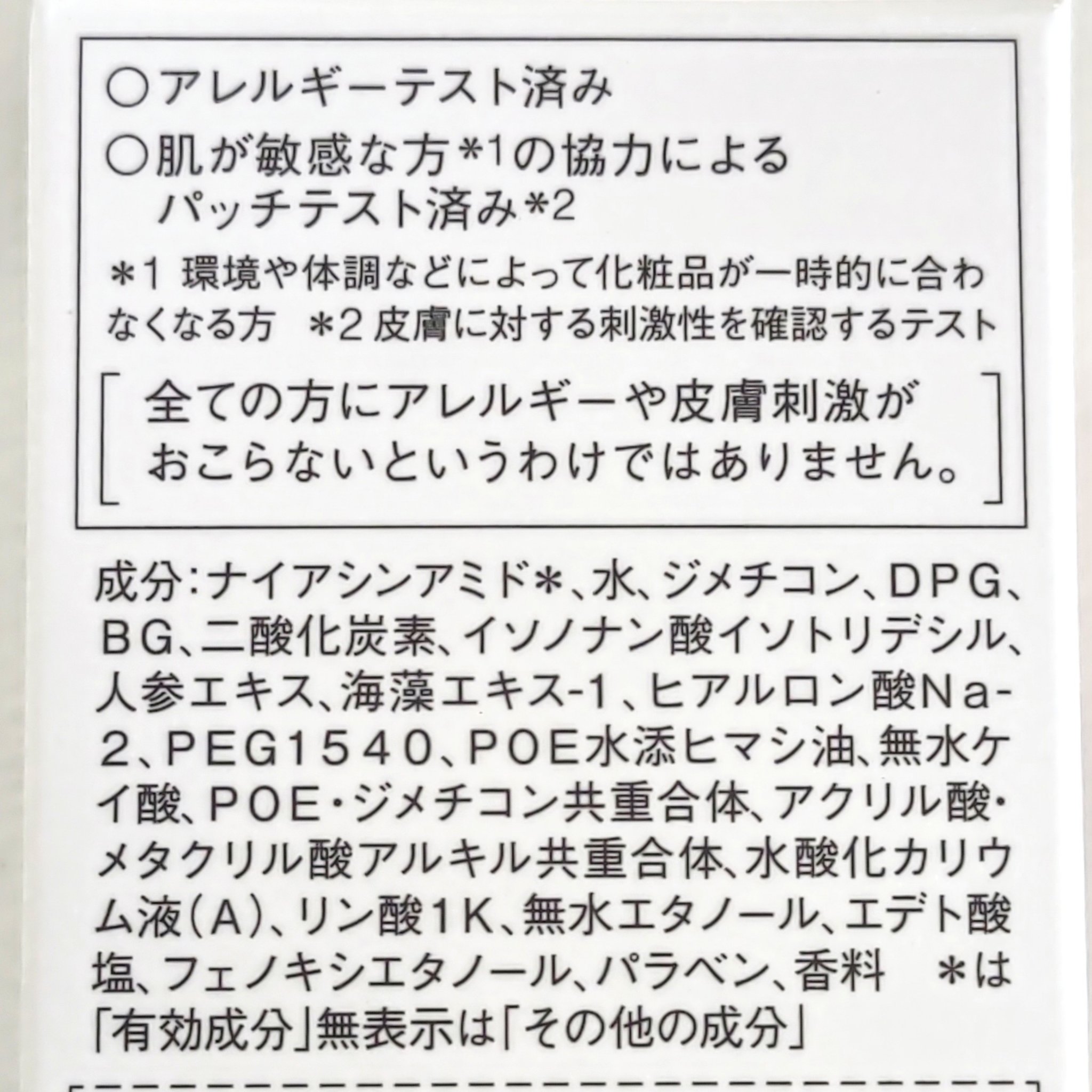 - <本体 90g> 有効成分 ナイアシンアミド その他の成分 水、ジメチコン、DPG、BG、二酸化炭素、イソノナン酸イソトリデシル、人参エキス、海藻エキス-1、ヒアルロン酸Na-2、PEG1540、POE水添ヒマシ油、無水ケイ酸、POE・ジメチコン共重合体、アクリル酸・メタクリル酸アルキル共重合体、水酸化カリウム液(A)、リン酸1K、無水エタノール、エデト酸塩、フェノキシエタノール、パラベン、香料 <レフィル 90g> 有効成分 ナイアシンアミド その他の成分 水、ジメチコン、DPG、BG、二酸化炭素、イソノナン酸イソトリデシル、人参エキス、海藻エキス-1、ヒアルロン酸Na-2、PEG1540、POE水添ヒマシ油、無水ケイ酸、POE・ジメチコン共重合体、アクリル酸・メタクリル酸アルキル共重合体、水酸化カリウム液(A)、リン酸1K、無水エタノール、エデト酸塩、フェノキシエタノール、パラベン、香料 <レフィル 180g> 有効成分 ナイアシンアミド その他の成分 水、ジメチコン、DPG、BG、二酸化炭素、イソノナン酸イソトリデシル、人参エキス、海藻エキス-1、ヒアルロン酸Na-2、PEG1540、POE水添ヒマシ油、無水ケイ酸、POE・ジメチコン共重合体、アクリル酸・メタクリル酸アルキル共重合体、水酸化カリウム液(A)、リン酸1K、無水エタノール、エデト酸塩、フェノキシエタノール、パラベン、香料 <レフィル 90g×2本セット(限定品)> 有効成分 ナイアシンアミド その他の成分 水、ジメチコン、DPG、BG、二酸化炭素、イソノナン酸イソトリデシル、人参エキス、海藻エキス-1、ヒアルロン酸Na-2、PEG1540、POE水添ヒマシ油、無水ケイ酸、POE・ジメチコン共重合体、アクリル酸・メタクリル酸アルキル共重合体、水酸化カリウム液(A)、リン酸1K、無水エタノール、エデト酸塩、フェノキシエタノール、パラベン、香料