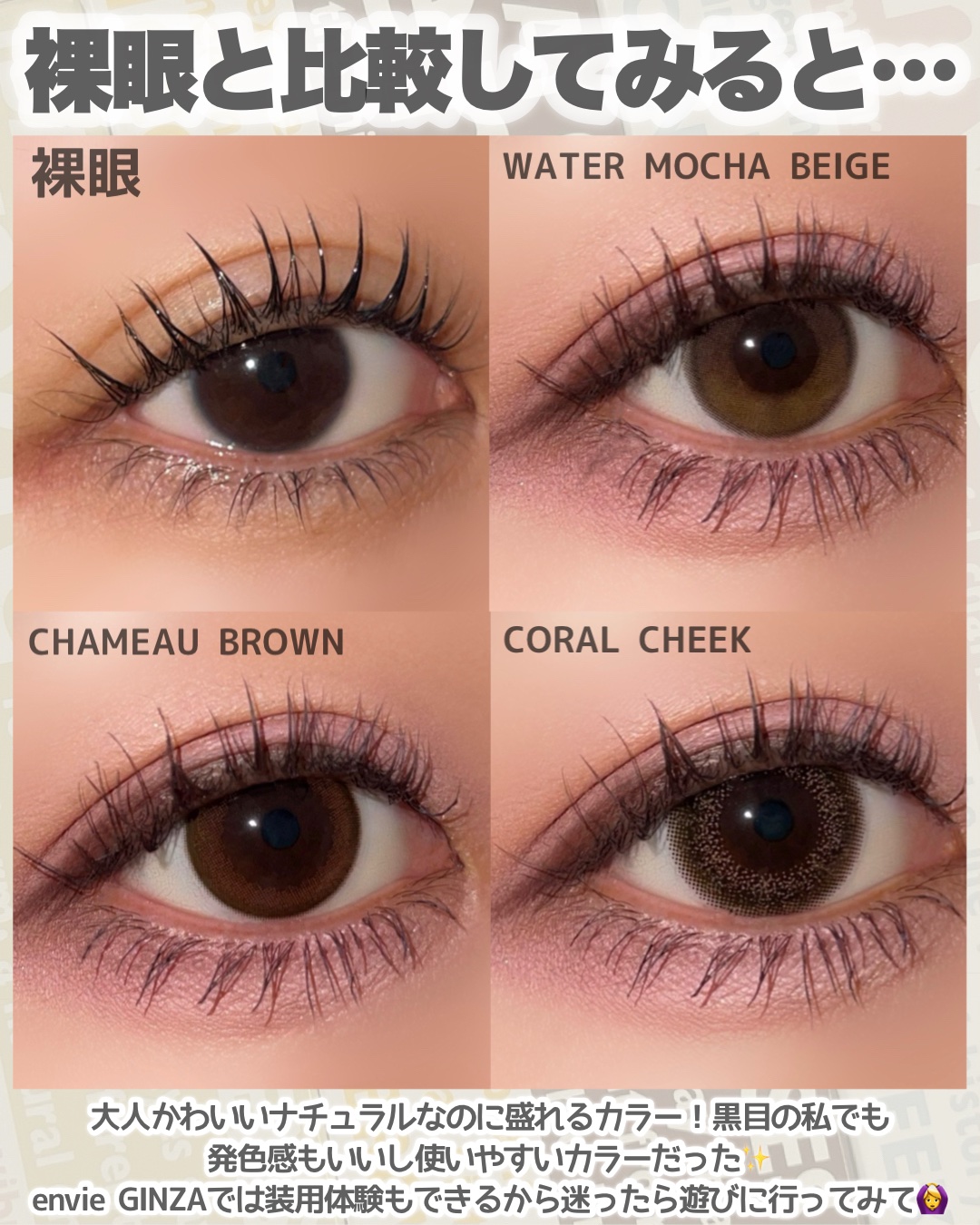 大人カラコンブランド「envie」店舗推しカラー3選!envie1dayCHAMEAUBROWNWATERMOCHABEIGECORALCHEEK◆CHAMEAUBROWNDIA14.0mm/GDIA12.9mmベーシックなオレンジブラウン。...