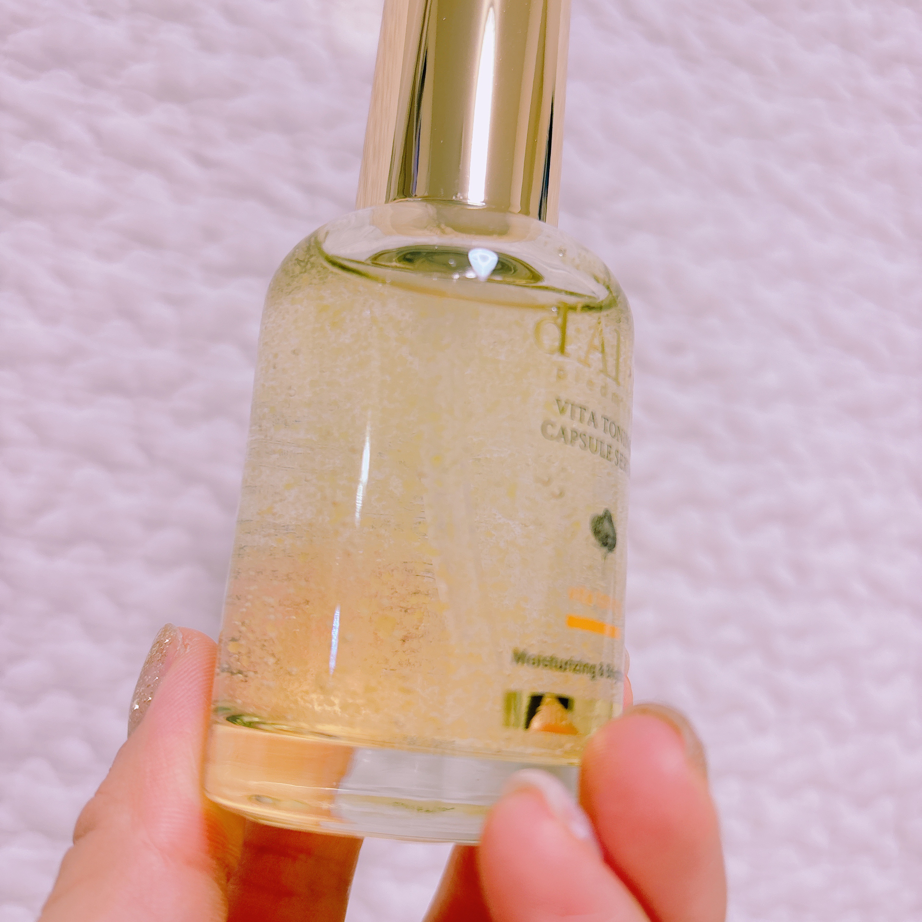 - 肌を明るくする4万*Vitaカプセルで透き通った華やかなビタトーニング べたつかずなめらかなビタミンカプセルセラム *本品容量100ml基準(製造バラつきあり、内部算出基準) 水分で満たされたふっくらとした水分ベースとビタミンカプセルが素早くブレンドされ水分膜を形成し、べたつかず、なめらかな仕上がり 【ご使用方法】 洗顔後、適量を手にとり、肌のキメに沿ってやさしくのばした後、軽くたたいて吸収させます。 TIP.2~3回レイヤリングすると、保湿·栄養集中ケアに役立ちます。 【使用上の注意】 お肌に異常が生じていないかよく注意して使用してください。 化粧品がお肌に合わないとき即ち次のような場合には、使用を中止してください。そのまま使用を続けますと、症状を悪化させることがありますので、皮ふ科専門医等にご相談されることをおすすめします。 (1)使用中、赤味、はれ、かゆみ、刺激、色抜け(白斑等)や黒ずみ等の異常があらわれた場合 (2)使用したお肌に、直射日光があたって(1)のような異常があらわれた場合