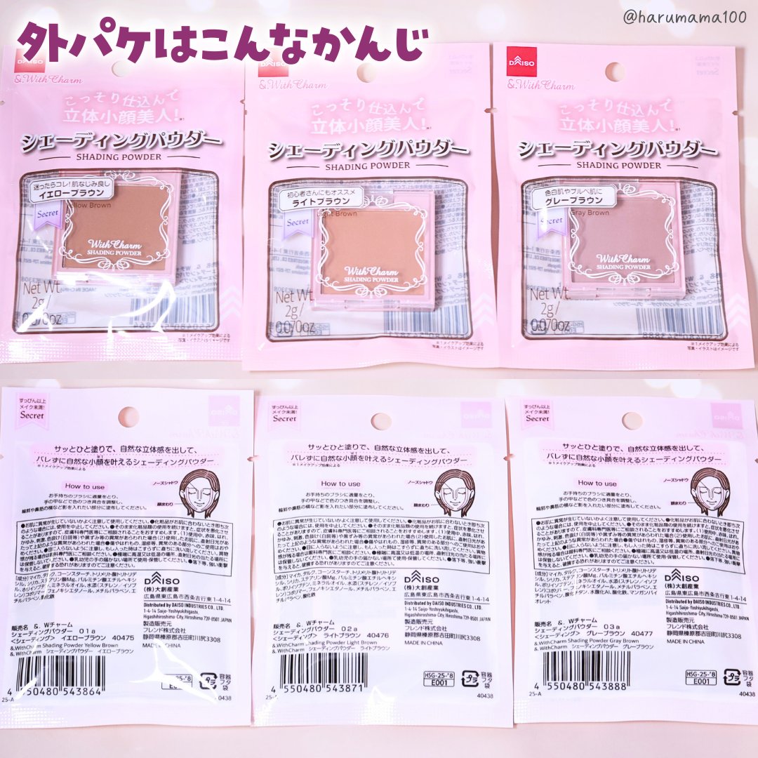 もう買った?DAISOの新作コスメ&.Wチャームシェーディングパウダー。イエローブラウン、ライトブラウン、グレーブラウンの3色展開で各種税込110円。ブラシは別で用意する必要があるけど発色も粉質も110円のクオリティには思えない🫢☑︎シェーデ...