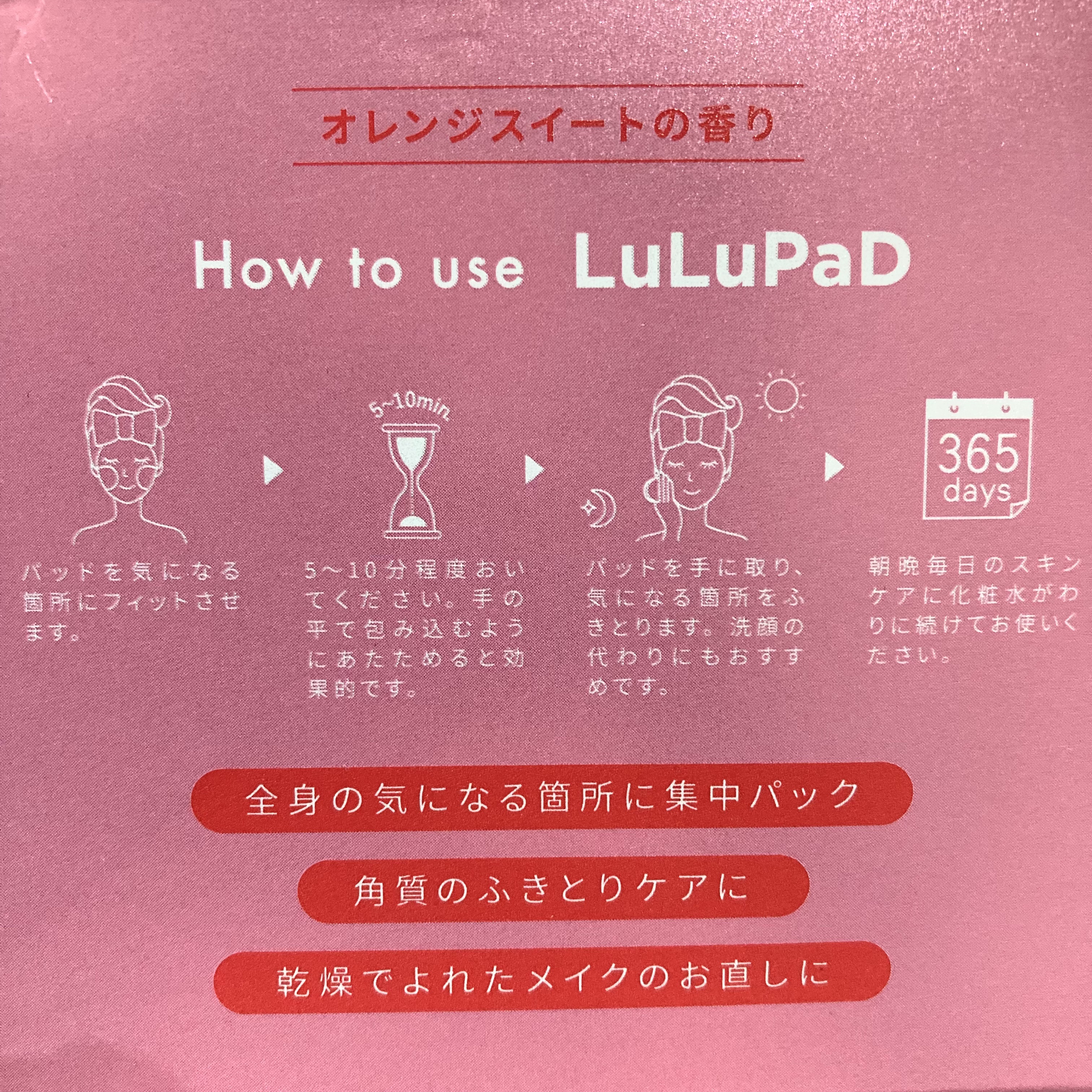 - <ルルルン トナーパッド うるおいON> 水、BG、グリセリン、キサンタンガム、フェノキシエタノール、メチルパラベン、香料、セラミドNG、水添レシチン、クエン酸、セラミドNP、PEG-60水添ヒマシ油、セラミドAP、セラミドEOP、ミリスチン酸ポリグリセリル-10、フィトステロールズ、クエン酸Na、レブリン酸、レブリン酸Na、セラミドAG、サッカロミセス/コメヌカ発酵液エキス、アズキ種子エキス、レウコノストック/ダイコン根発酵液