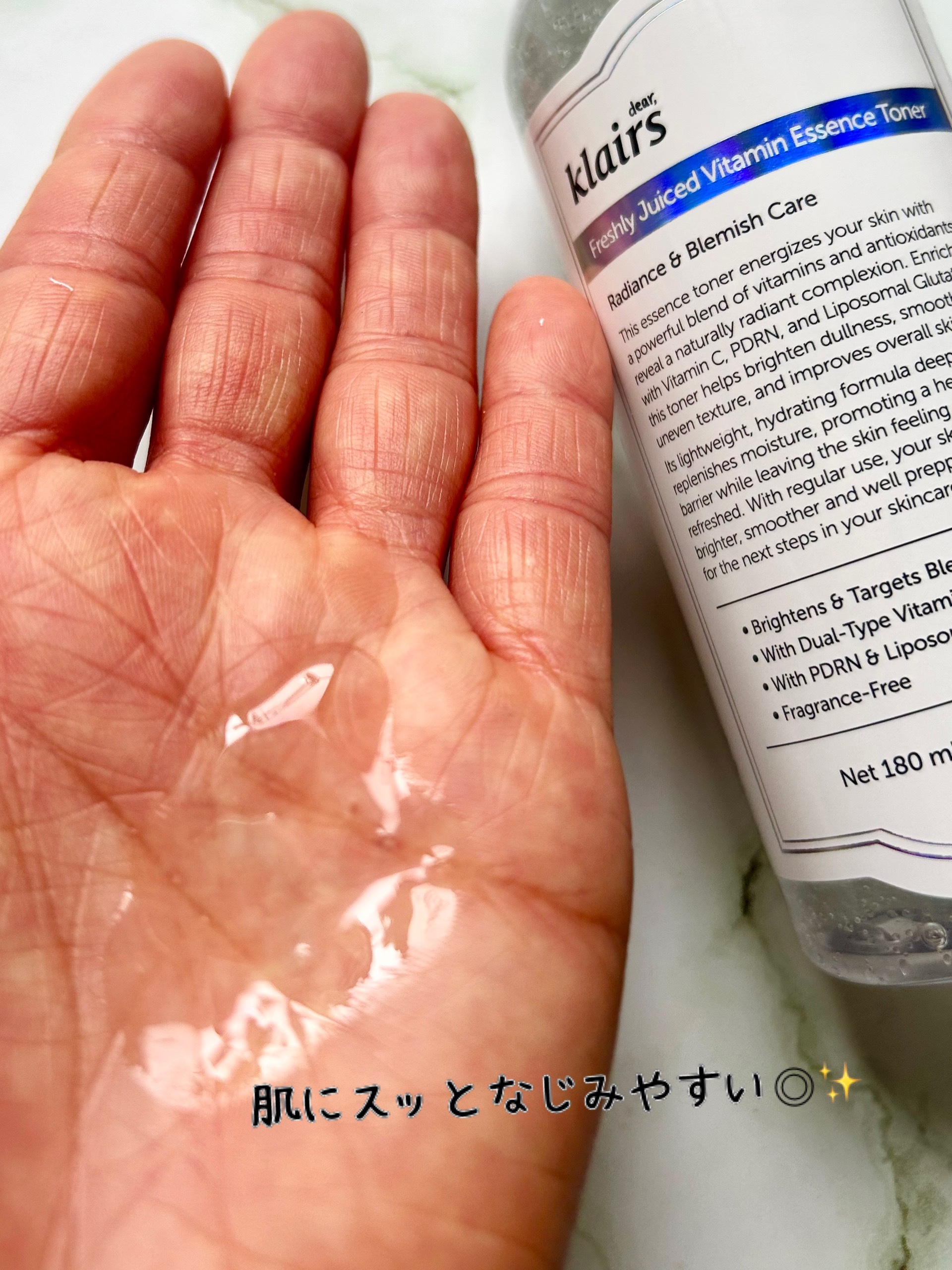 しっとりな使い心地がうれしい💛 高級感のあるガラスボトルがとっても素敵です! オイル層とローション層に分かれてるのでまずはよ~く振ってから使ってね。 オイルが入っているとは思えないようなサラッとしたテクスチャー✨ なじませると、みずみずしく しっとりとした使い心地です🤍 肌にほどよいツヤ感が出るので、ツヤ肌メイク好きの方にも向いている思う! 9つのフリー処方なのも、ゆらぎ肌にはうれしい処方だよね。