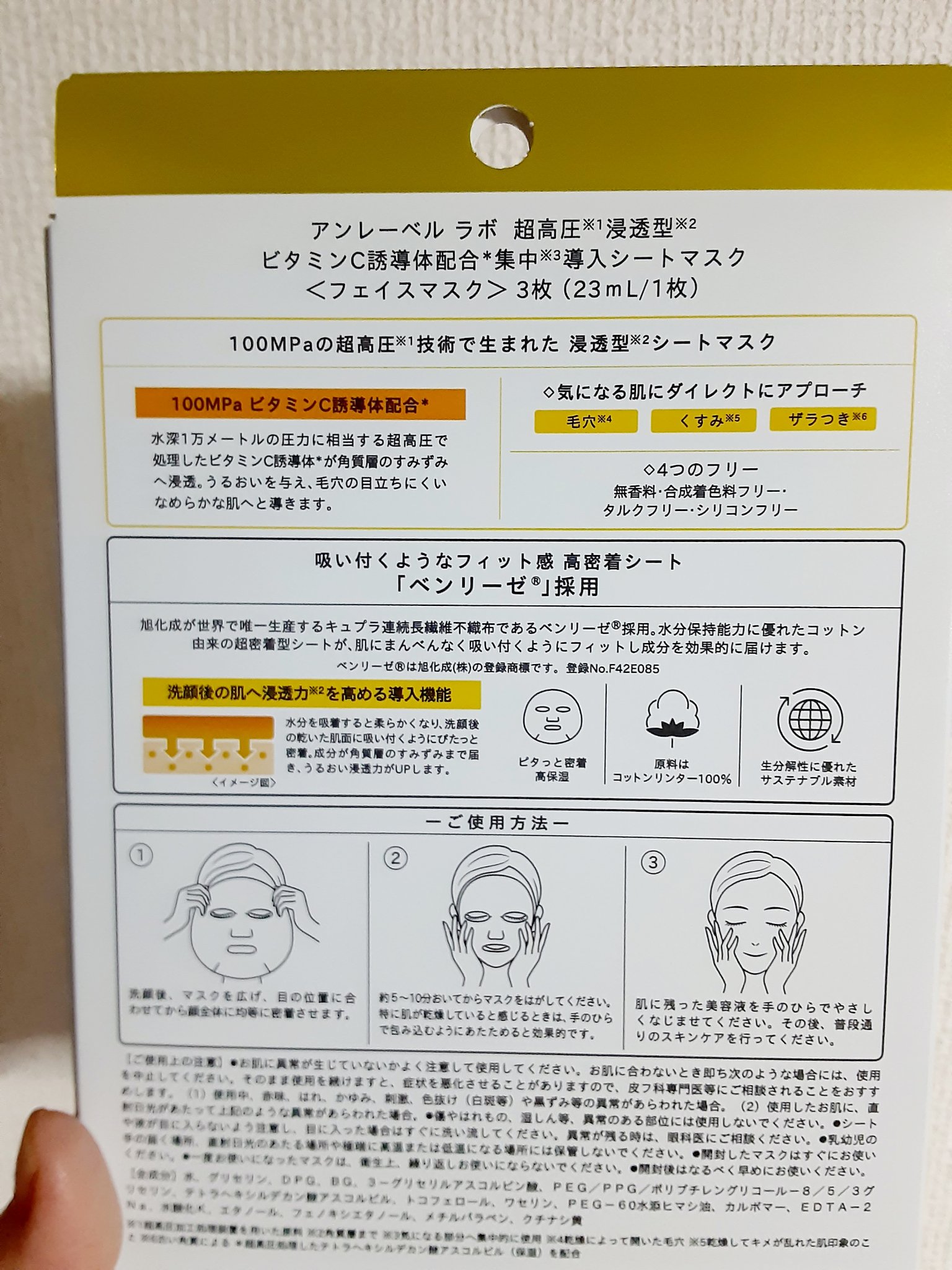 - 洗顔後の浸透力を高めるビタミンC*配合の先行導入シートマスク *超高圧処理したテトラヘキシルデカン酸アスコルビル(保湿)