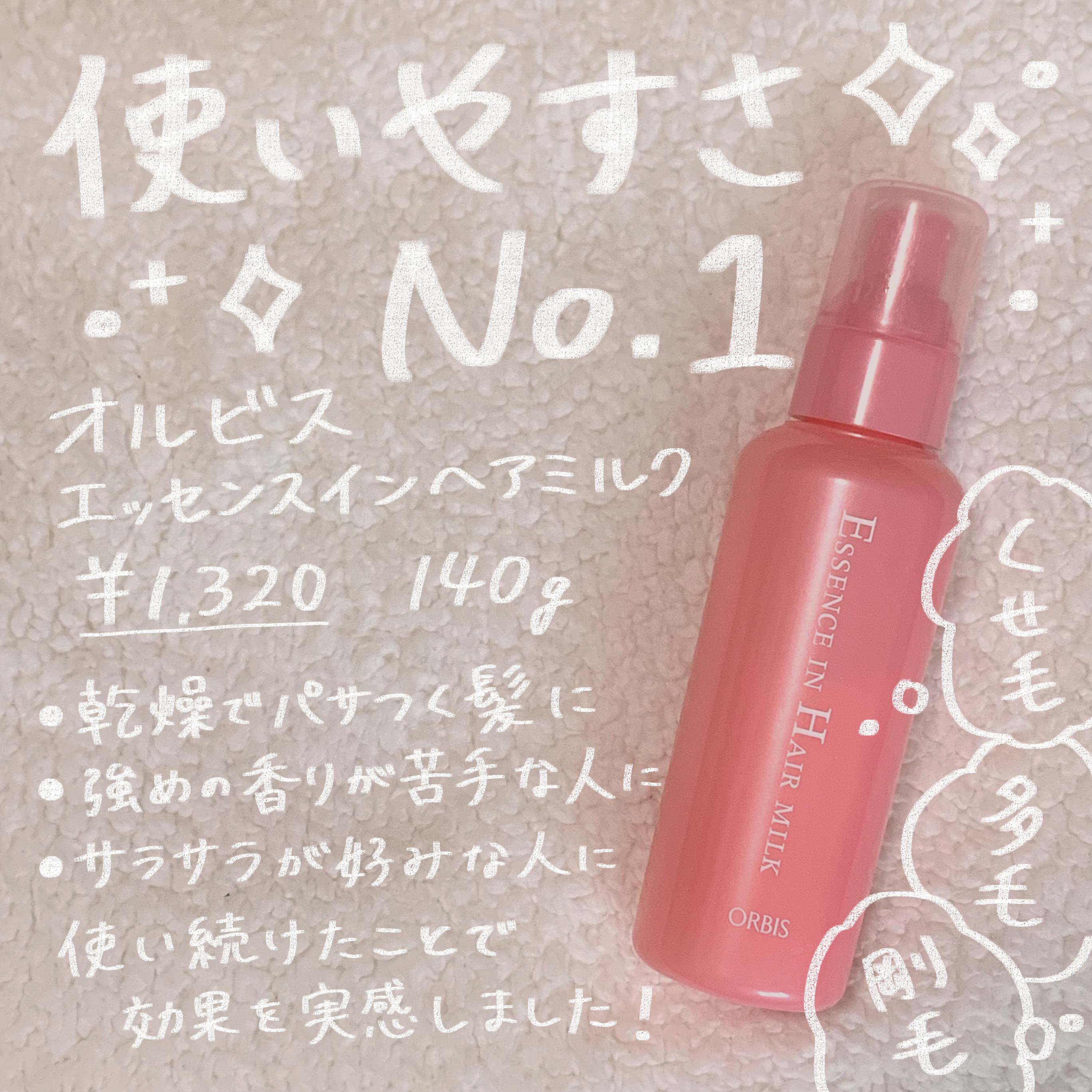 オルビスエッセンスインヘアミルクつめかえ用140g美容師さんに「細くて絡まりにくい髪にはオイルよりヘアミルクが良いよ」とアドバイスされたので使い始めました。タオルドライしてドライヤーの前に付けるとパサつきやうねりが抑えられます。ドライヤーの後...