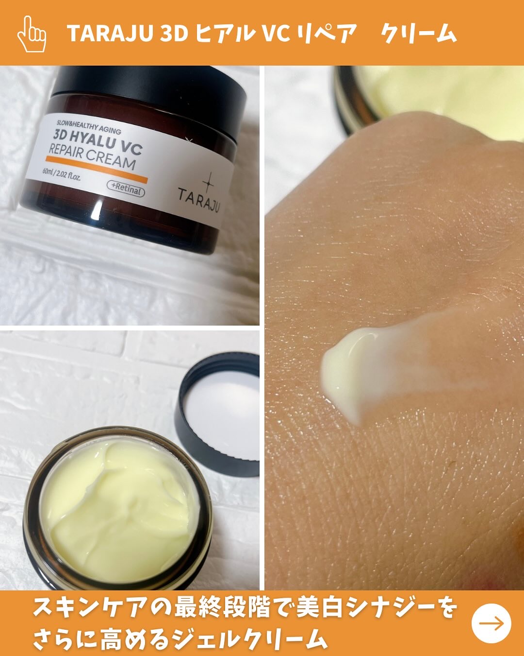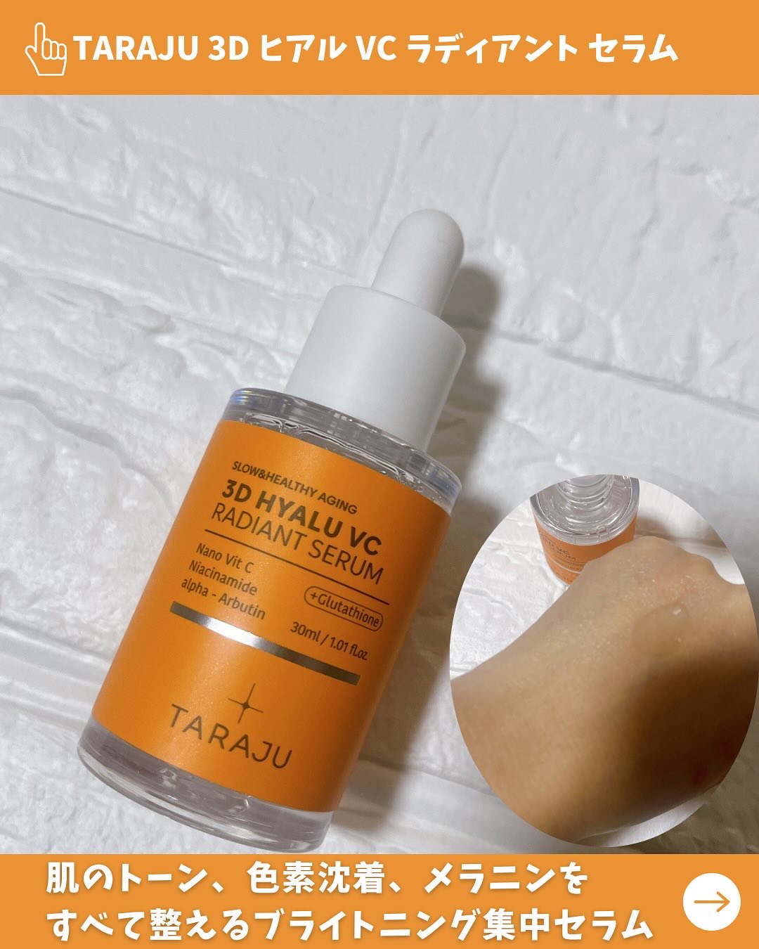 TARAJU美白シリーズ(全6種類)使ってみました💕まずは3つご紹介しますTARAJU3DヒアルVCカプセルトナー、ラディアントセラム、ラディアントクリームです♥全てに・・・★毛穴より小さい第3世代3DヒアルビタミンC配合★α-アルブチン配合...