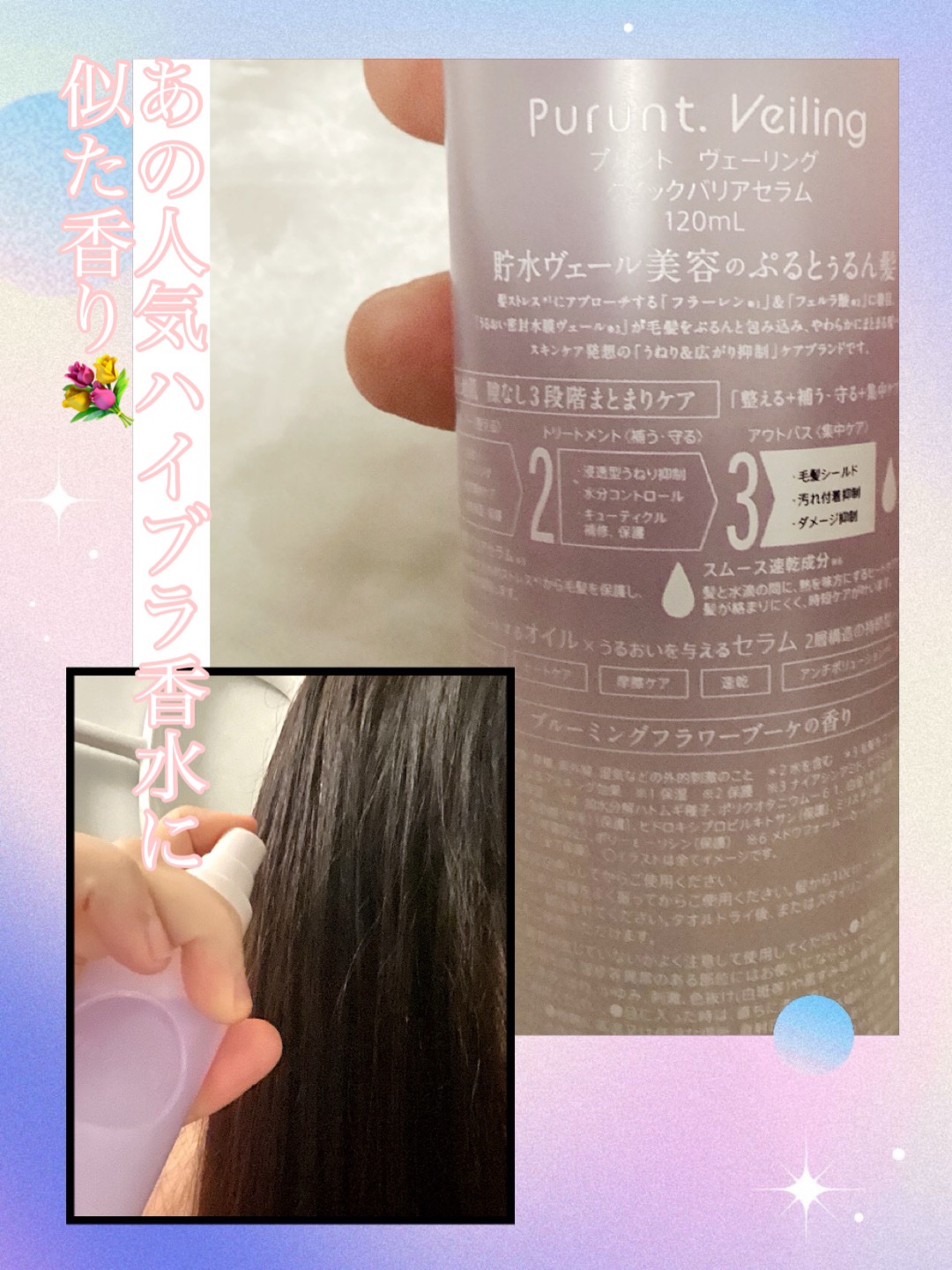 軽くしっかりした栄養感、素早く浸透する 栄養たっぷりクリーム層&水分たっぷりパフューム層 2 in 1 ダブルケアヘアミスト 細かい噴射力でたんぱく質が素早く浸透し、たくさん振りかけてもべたつかないダブルレイヤーミスト 霧のような細かいミストがふんわり広がって静電気も防いでくれるから乾燥している今の時期にもピッタリ⚡️