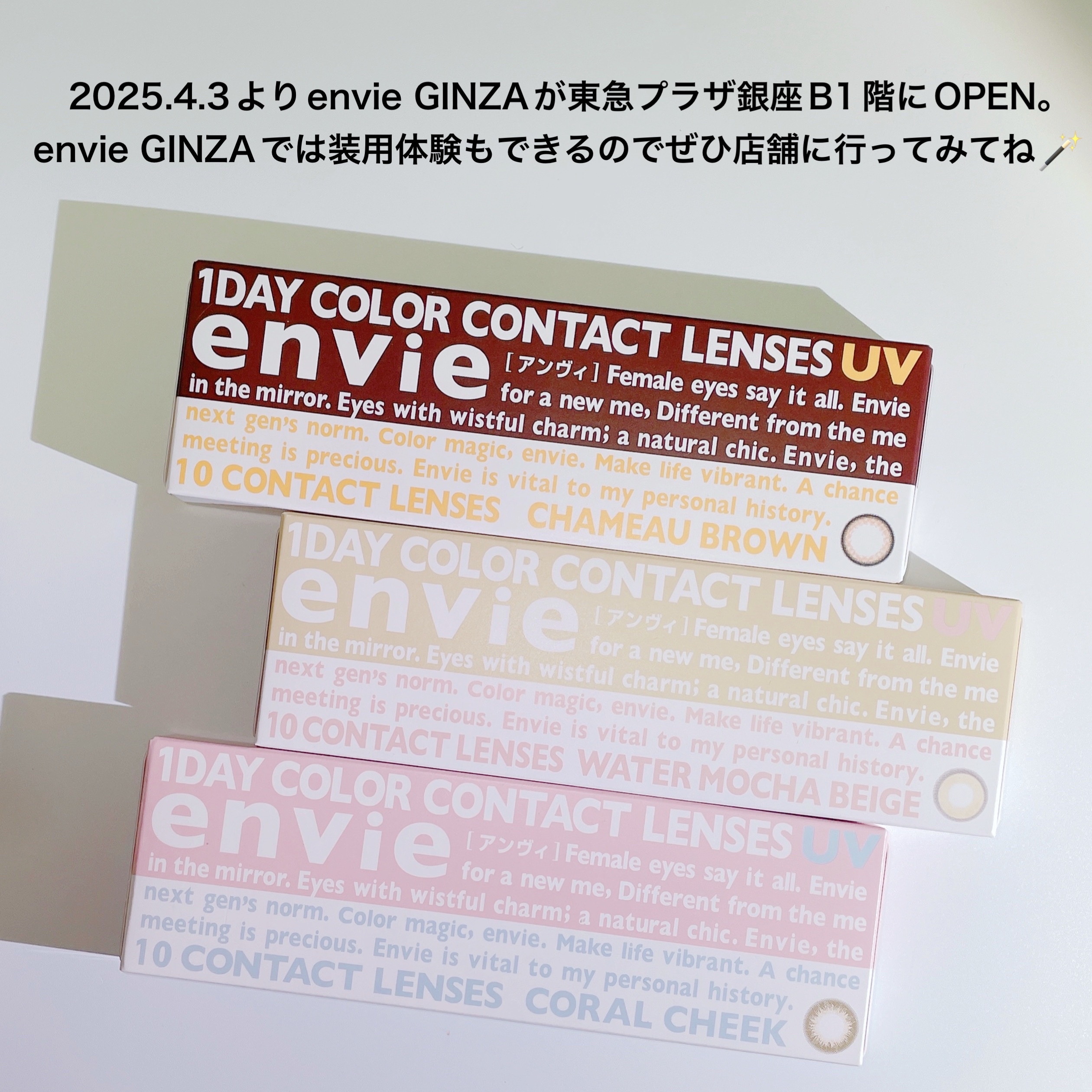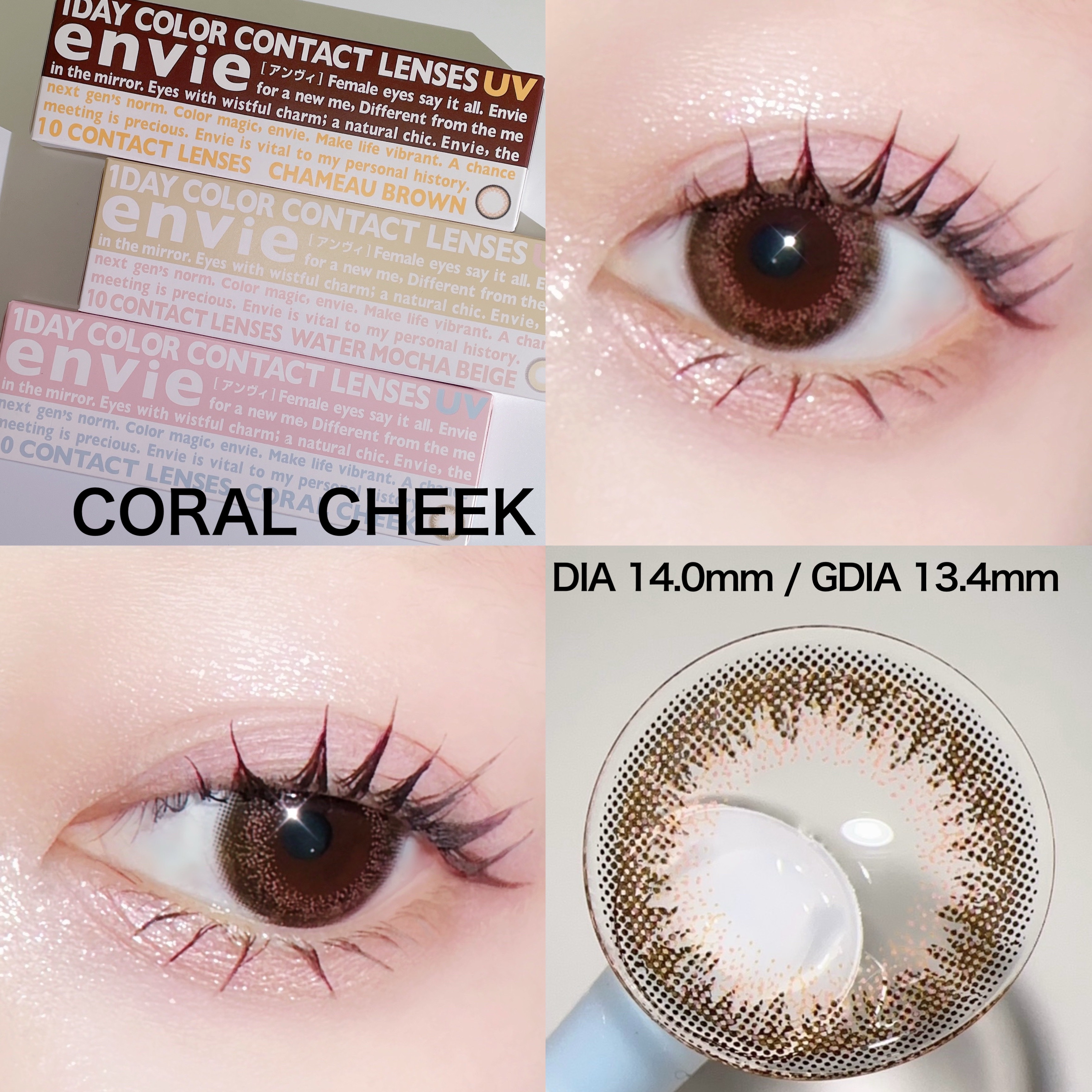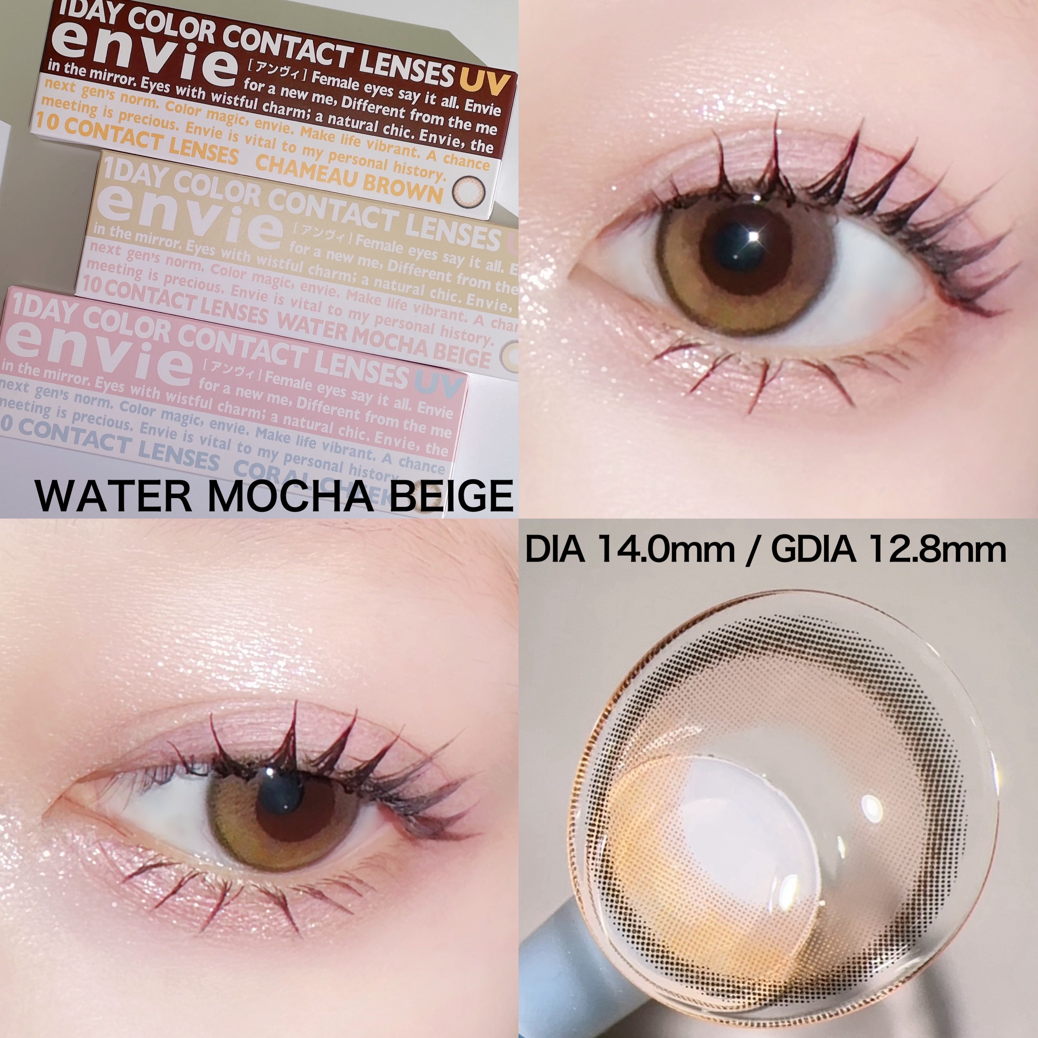 envienuanceseriesWATERMOCHABEIGEベージュニュアンスの水光感がたまらない「ウォーターモカベージュ」を装着してみました!DIA14.0mm/着色直径12.8mmで、ナチュラルだけどしっかり印象的な瞳に。水辺を映した...