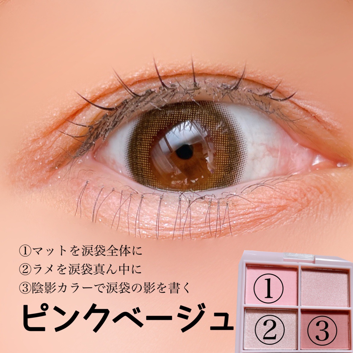 ダイソーコスメ新作!&.Wチャーム涙袋パレットピンクベージュ☑︎新シリーズ「&.WithCharm」☑︎¥110☑︎ラメ・パール・マット3パターンの涙袋が作れちゃう!アイシャドウチップ付きその日の気分やTPOに合わせて選べる、涙袋用アイシャド...