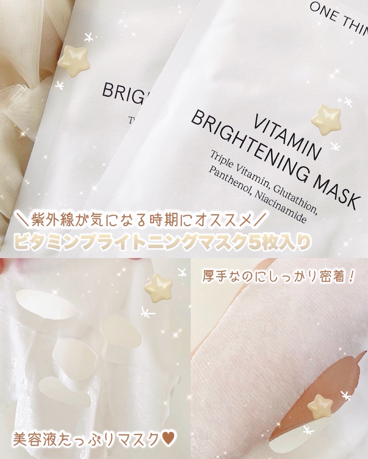 ナイアシンアミドで美白トリプルケア💛 ONE THINGのセット使いがすごくよかった✨ ナイアシンアミドグルタチオントナーはさっぱりシャバシャバなテクスチャーだけど肌になじませるとキメが整って肌触りがなめらかになるの✨ ビタミンブライトニングマスクはかなり厚手のシートが肌にぴたっと貼りついて肌にうるおいをチャージしてくれるよ✨