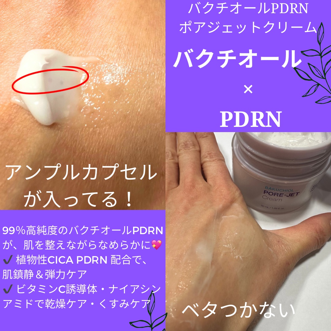 低刺激・高効能の独自の成分バクチオールPDRN配合。 弾力ケア、キメケア、毛穴ケアと多機能✨ 植物由来の鎮静効果のある成分と、レチノールよりも刺激が少なく弾力効果の高いバクチオールを組み合わせ🤲🏻 毛穴より2600倍小さく作られた2重のエクソソームが肌の角質層まで美容成分を届けてくれるそうです🥰