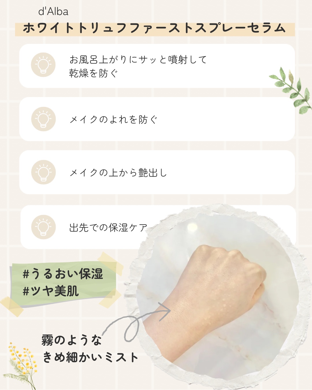 d'Alba様より、ホワイトトリュフファーストスプレーセラムをいただきました🥹✨✼••┈┈••✼••┈┈••✼••┈┈••✼••┈┈••✼韓国のCAさんも使っていると話題になり、大人気のホワイトトリュフファーストスプレーセラム👑✨️オイル層と...