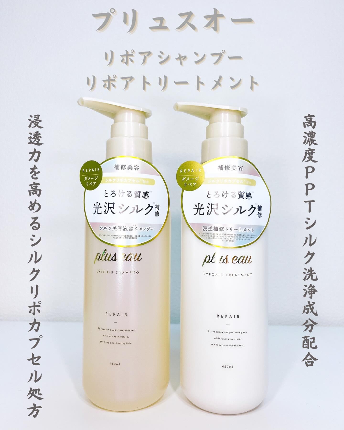 🫧pluseauリポアシャンプー/リポアトリートメントLIPSベストコスメ多数受賞のプリュスオーからダメージ補修シリーズ新登場!浸透性の高いシルクリポカプセルを補修成分として配合、とろける質感&しっとり濃密。洗いながら髪ダメージを補修するP...