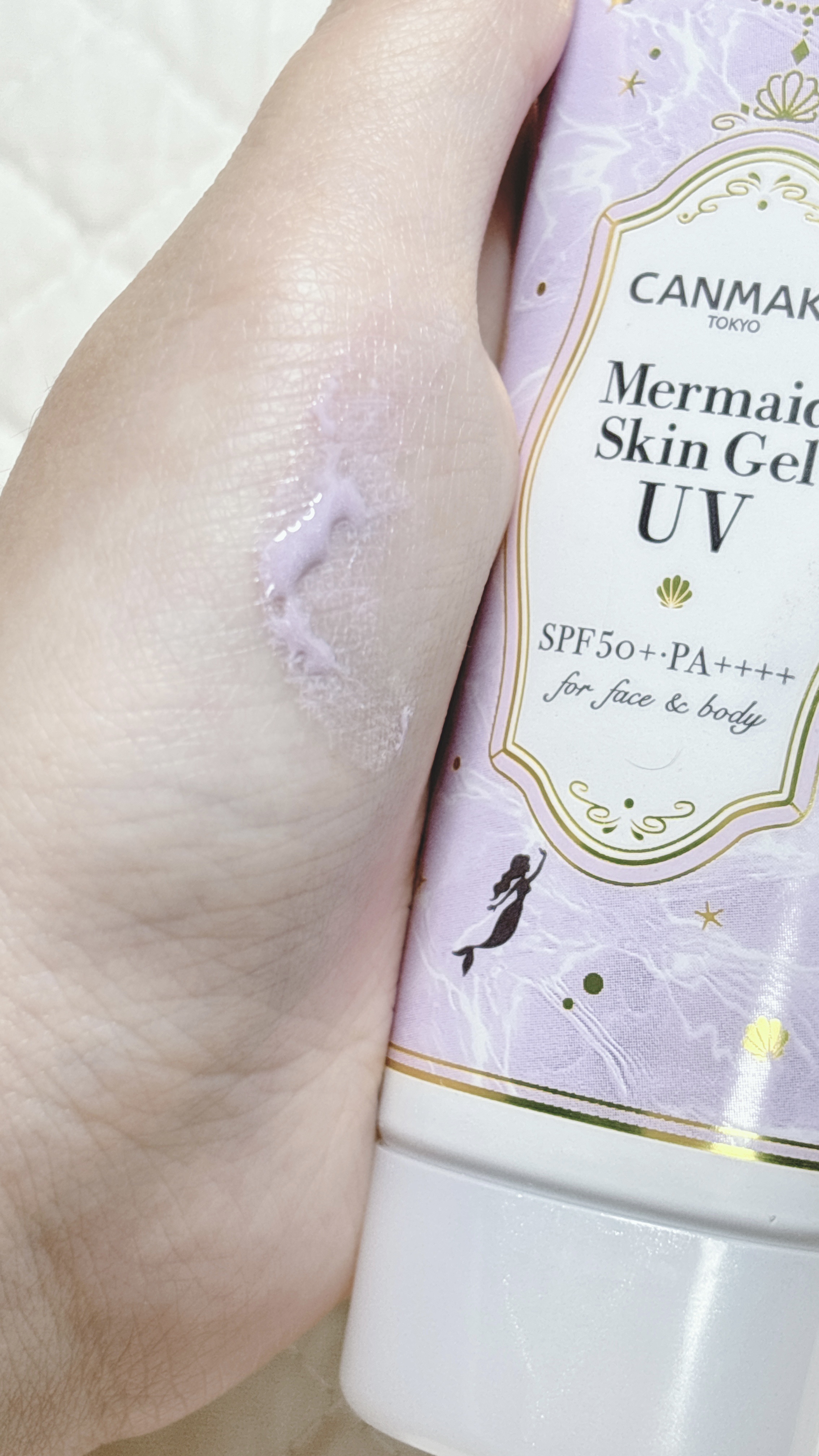 顔と首の色を揃えるのにぴったりなアイテム✨ この2つがマーメイドスキンジェルUVの中でも特に肌をトーンアップできると思います! 塗り心地、日焼け止め効果、コスパ、色々な面でとても優秀✨✨ 顔と首の色のチグハグに悩んでいる方はマーメイドスキンジェルUVを首に使うのがおすすめです╰(*´︶`*)╯
