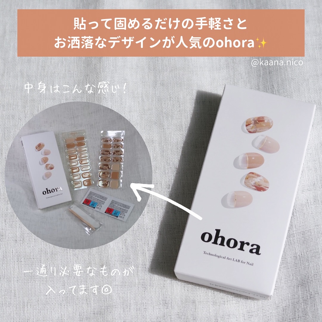 ohora昔、セルフでジェルネイルしてたけど簡単なデザインしか出来ないし、道具をたくさん揃えたりが大変で💦ohoraのネイルシールだと、貼った後にはみ出た部分をカットしてジェルランプで硬化するだけ!貼って固めるだけで凝ったデザインが簡単に完成...