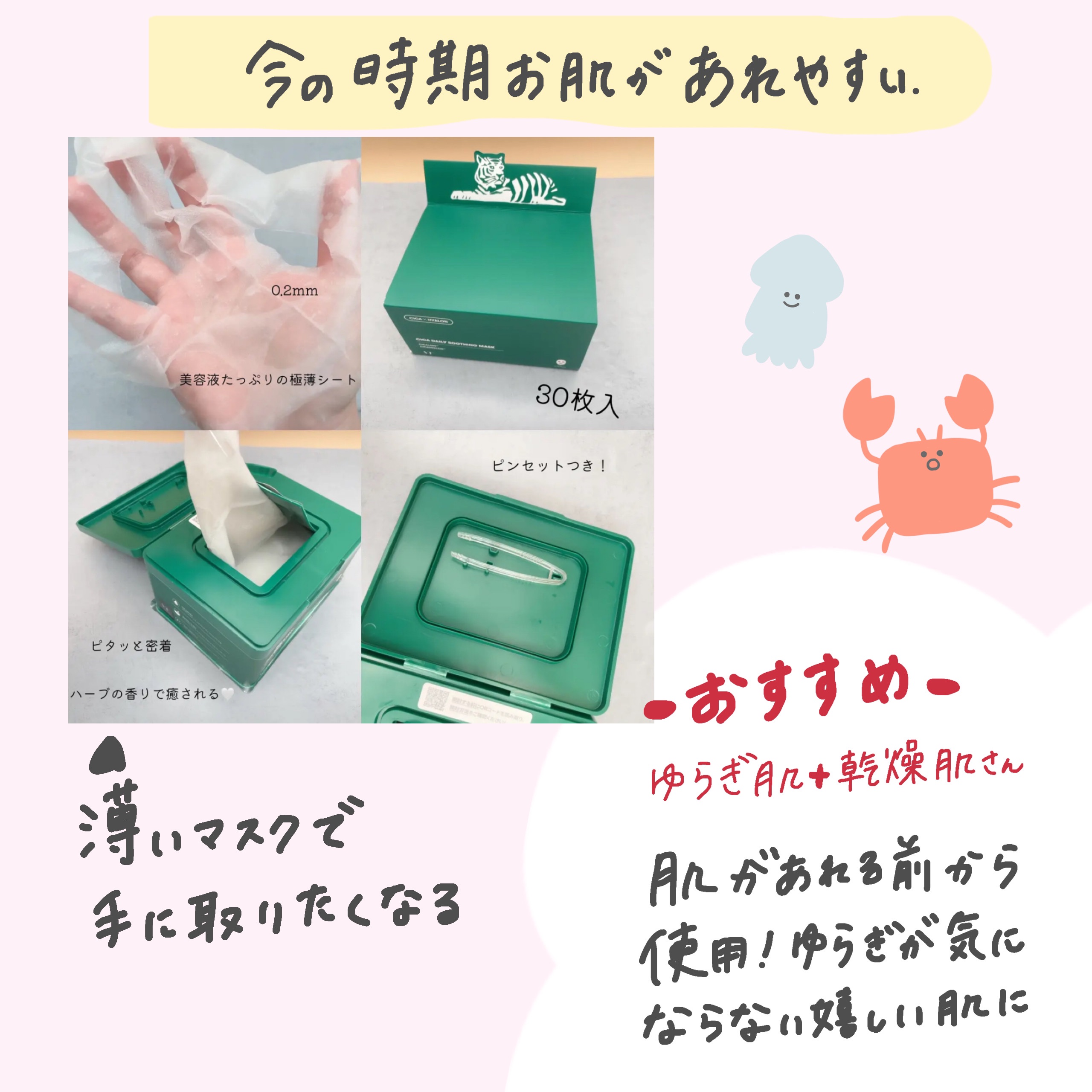 - 1日10分貼っておくだけ!乾いたゆらぎ肌に クイック整肌&水分ケア!1日に1枚ずつ! デイリーケアにぴったりな30枚入りの大容量シートマスク ■TIP メイク前の10分、時短メンテナンスケア。 肌をなめらかにして、化粧ノリが良くなります。 忙しいときはながらケアとしておすすめ! ■使用方法 洗顔後、化粧水で肌を整えた後、 蓋を開けてミニピンセットで1枚取り出します。 シートマスクを顔に均等に密着させ10分後にはがし、 残りの美容液はてのひら全体で優しくなじませます。