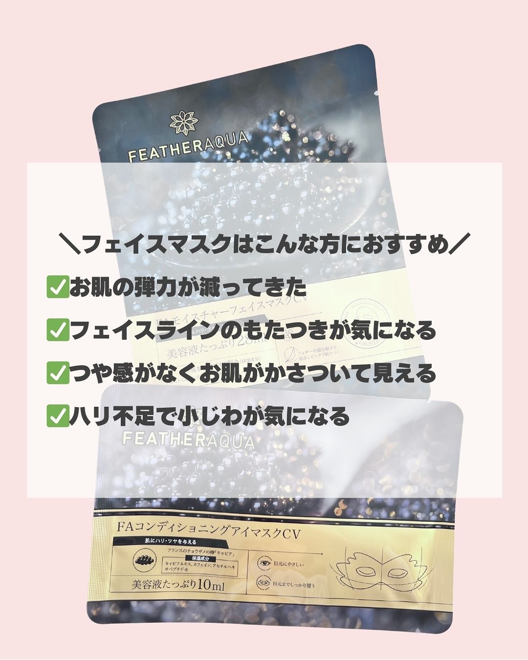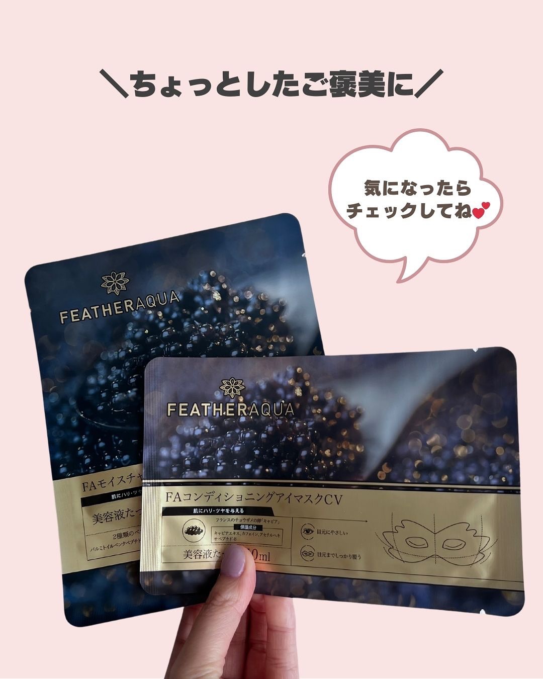FEATHERAQUAFAモイスチャーフェイスマスクCVフランス産のキャビアエキスを配合した美容液がたっぷり28mlも入ったフェイスマスクと、目元に集中アプローチできるアイシートのセット。✔︎キャビアエキスはアミノ酸やタンパク質、ビタミンCに...
