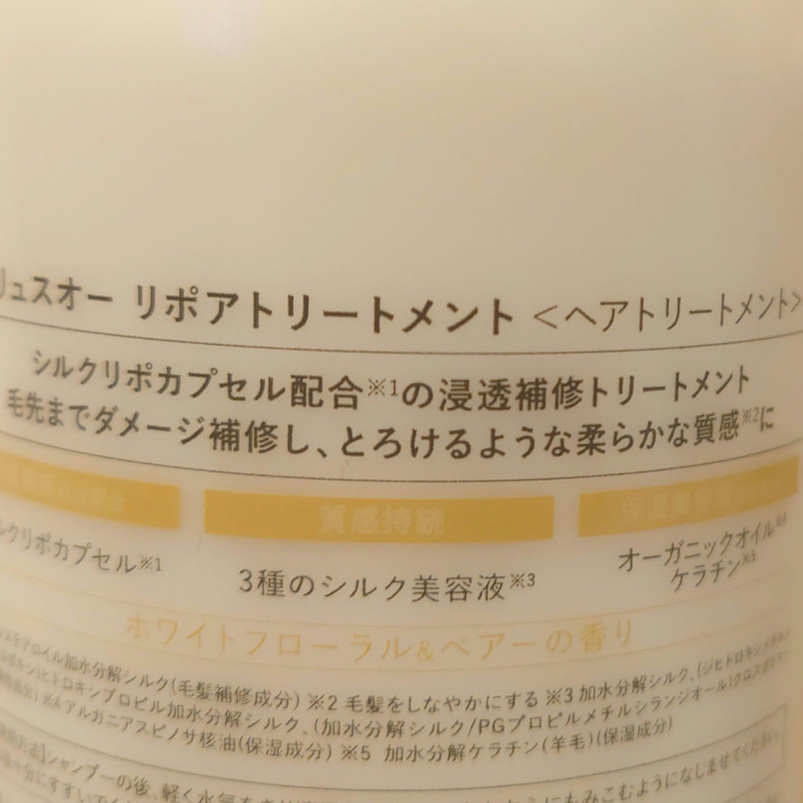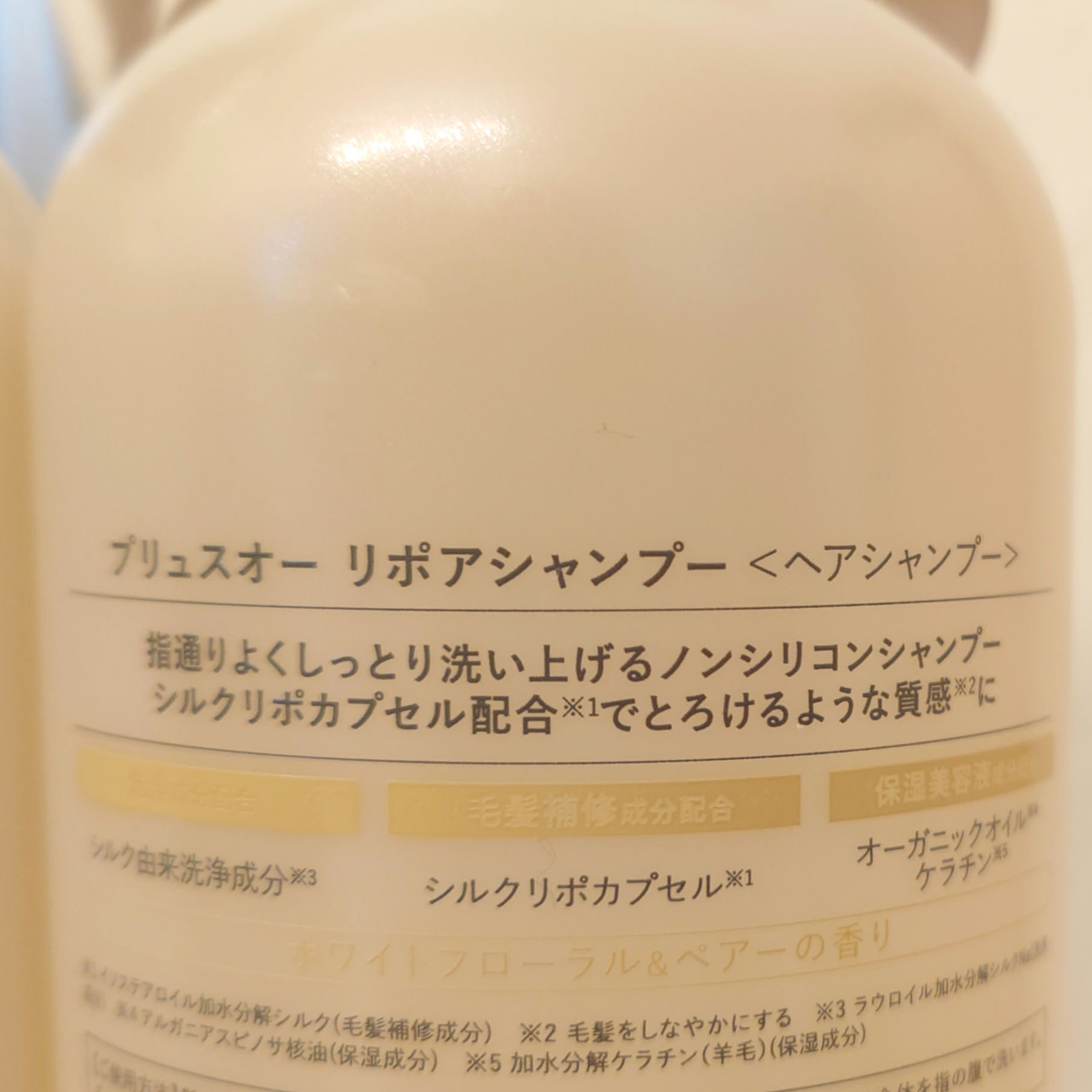 気になる香りはホワイトフローラル&ペアー💐🍐 浸透性の高い「シルクリポカプセル」配合でダメージ補修にも効果的だそうです シャンプーは泡立ちが良いのでさっぱりとした洗い心地を感じました トリートメントは塗り込んだ後のトゥルンとした感じは無かったものの、ドライヤー後にはフンワリ仕上がりました