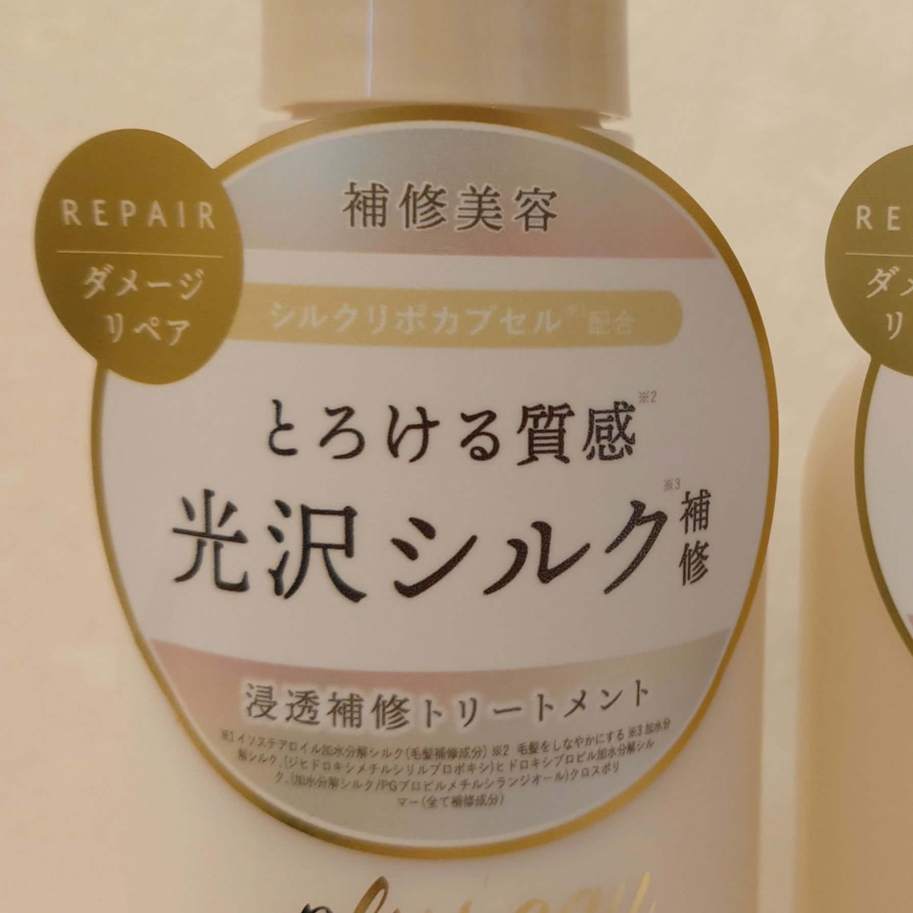 - とろけるような質感と、ダメージでパサつきがちな髪も毛先までツヤめくしっとり髪へ導く美容液シャンプー&光沢補修トリートメント。 より浸透性が高くなるカプセル化技術を採用したシルクリポカプセルを補修成分として配合。 髪の芯まで徹底補修しながらキューティクルをなめらかに整え、しっとりと潤いツヤめく髪へと導きます。 また洗いながらも髪ダメージを補修するPPT系洗浄成分を、シリーズ比で高濃度に配合。 シルク由来PPT系洗浄成分と、肌のことを考えたアミノ酸系の4種の洗浄成分とバランスよくブレンドすることでキメ細かな濃密補修泡が摩擦レスでリッチな洗い心地を実現し、髪と頭皮をいたわりながらシャンプーでも毛髪ダメージに徹底アプローチします。 カシミヤ由来のケラチンをはじめとする2種のケラチン、コラーゲン、CMC類似成分などのこだわり配合した補修成分だけでなく、美容保湿成分をたっぷり浸透させて密封補修することで、カラーや熱ダメージによるパサつき・広がり・ゴワつきなどの蓄積ダメージもしっかりケア。 ドライヤーやヘアアイロンの熱ダメージから髪を守りツヤを与える、ヒートリペア成分を配合して熱も味方に。 清楚な上品さを纏うホワイトフローラル&ペア―の香り。 2024年10月中旬 一部企業にて先行発売
