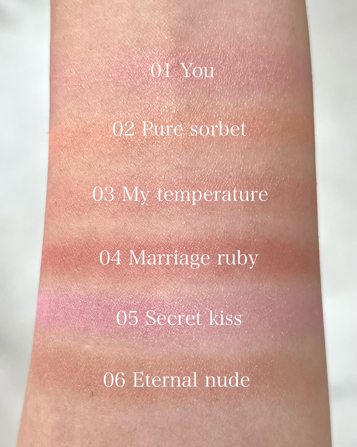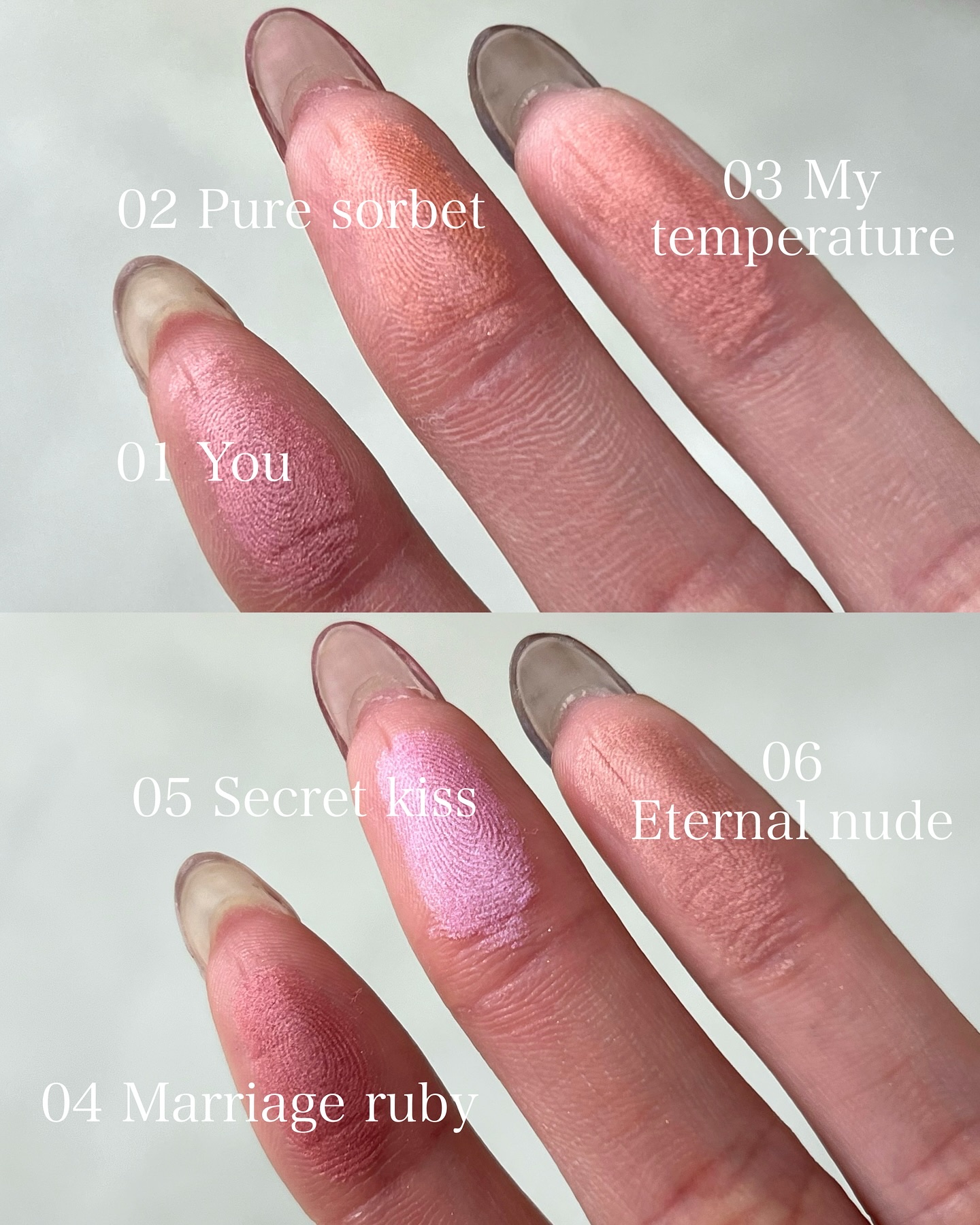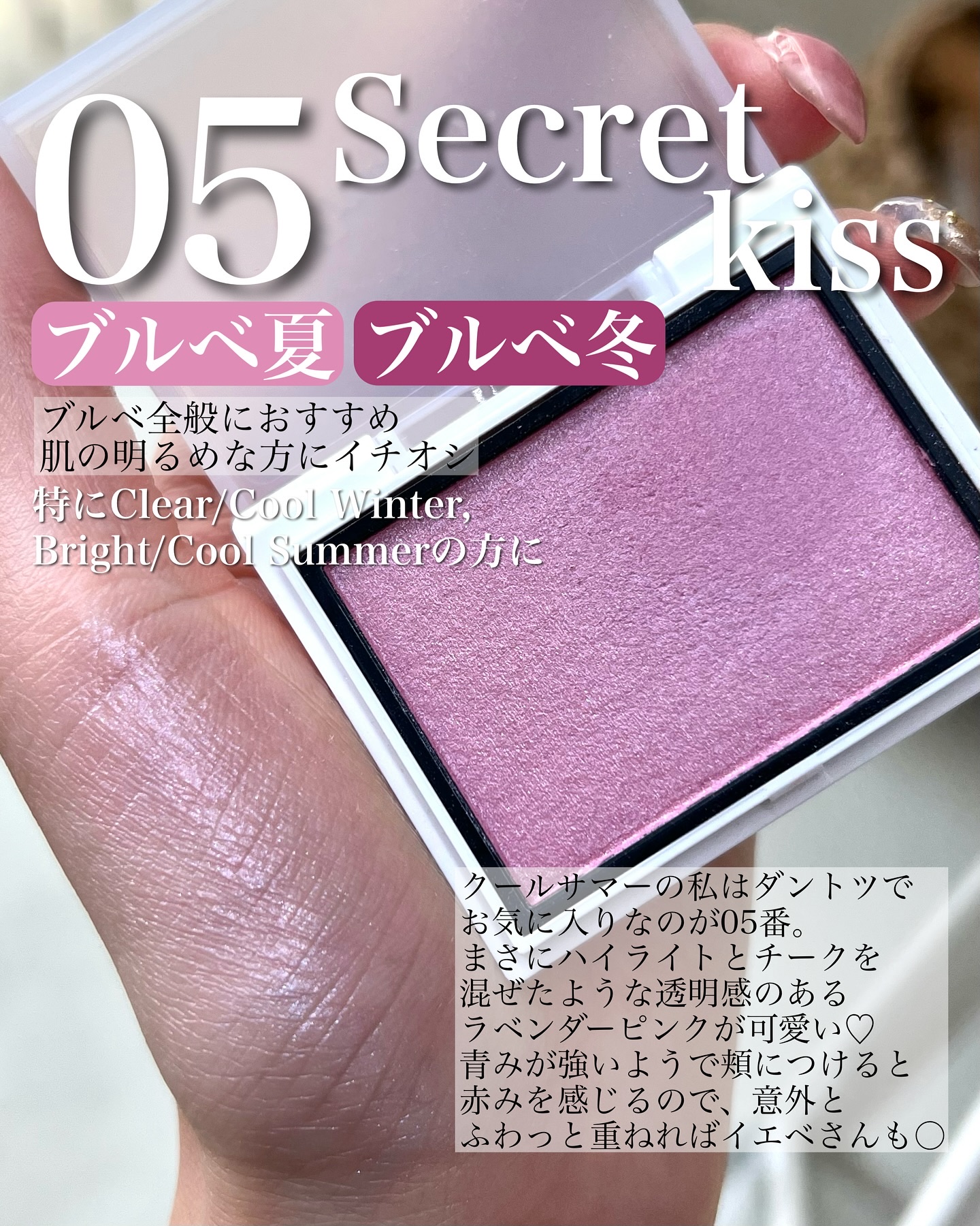 Enamorメロウメルティングチーク05Secretkiss¥2,420✂かじえりさんらしい上品なツヤがキレイに出せるチーク。ハイライトか!?と思うぐらい輝く。透けツヤ〜😌✨✨これは他のカラーも欲しくなる...普段買わないベージュカラーもいい...