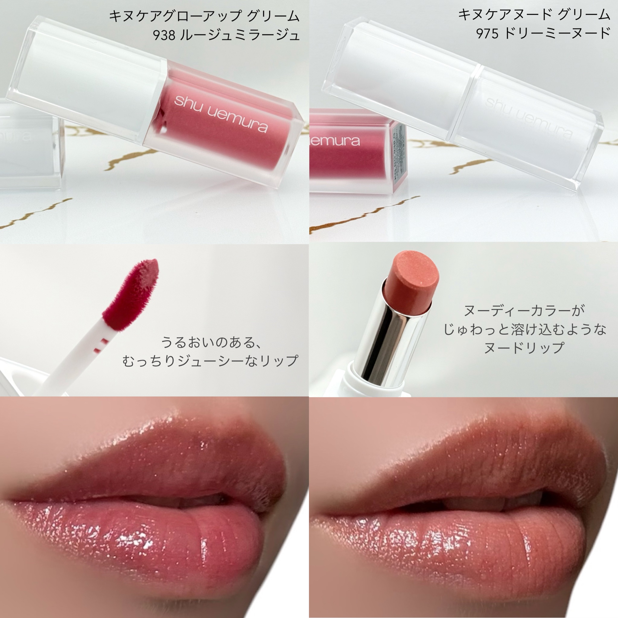 \4月11日発売.ᐟ.ᐟ/"濡れツヤパール配合"🫧LIPSでも高評価のバズリップ「キヌケアシリーズ」から新製品が登場𖤐´-▶︎shuuemuraキヌケアヌードグリームBG975Gドリーミーヌードくちびるから創る透明感演出。レフ板リップで顔色...