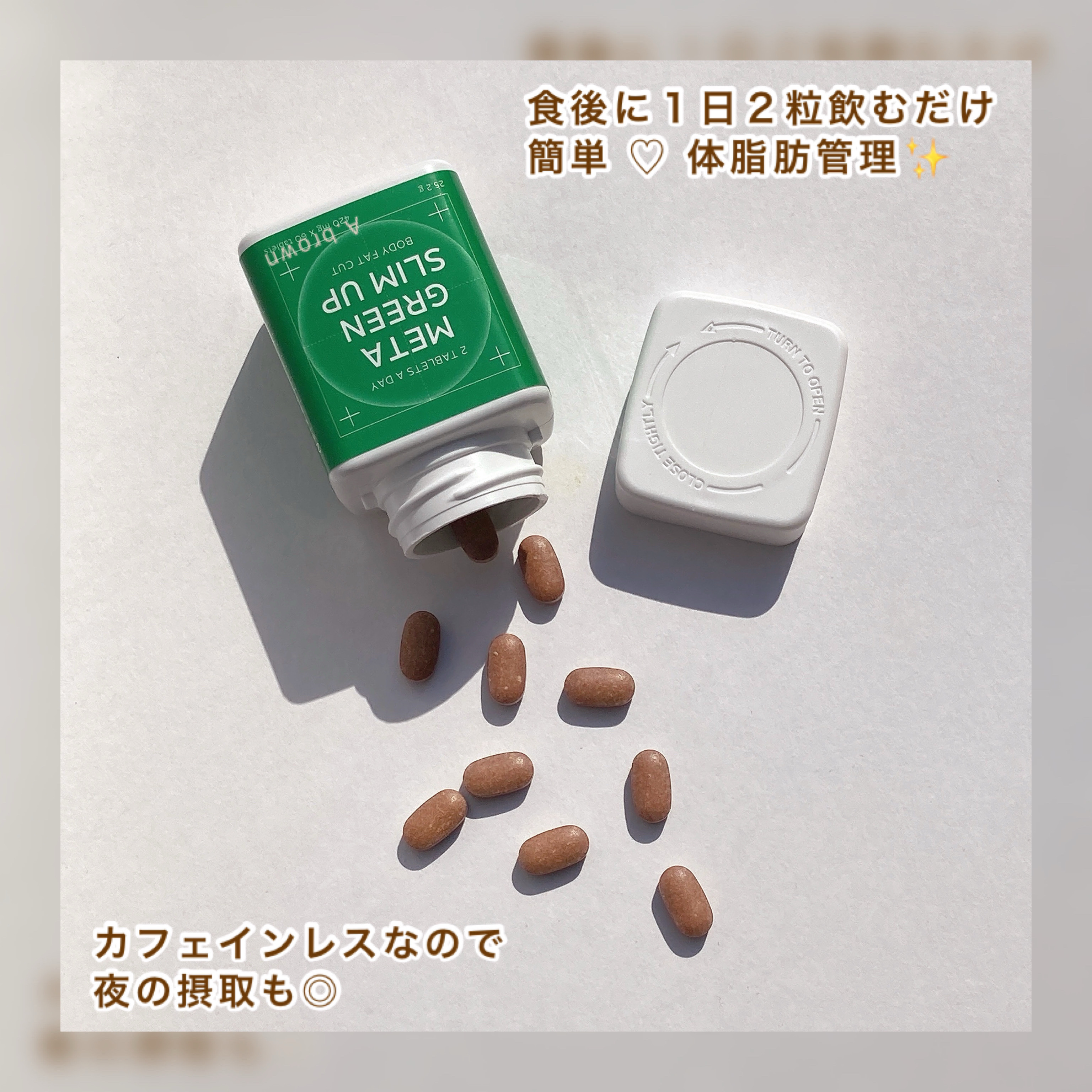 体脂肪の減少を手伝ってくれる緑茶カテキン高配合されているため、食事後の脂肪の吸収を抑えて、排出を手伝ってくれる商品🍵 サプリに腸溶性コーティングがされているので、口の中で溶けたりしません。サラサラとした表面で大きさもちょうど良いので喉に引っかからずすごく飲みやすい。 飲むのも1日2粒なので、私は朝晩と分けているし、こういう面でも飲みやすく感じています。