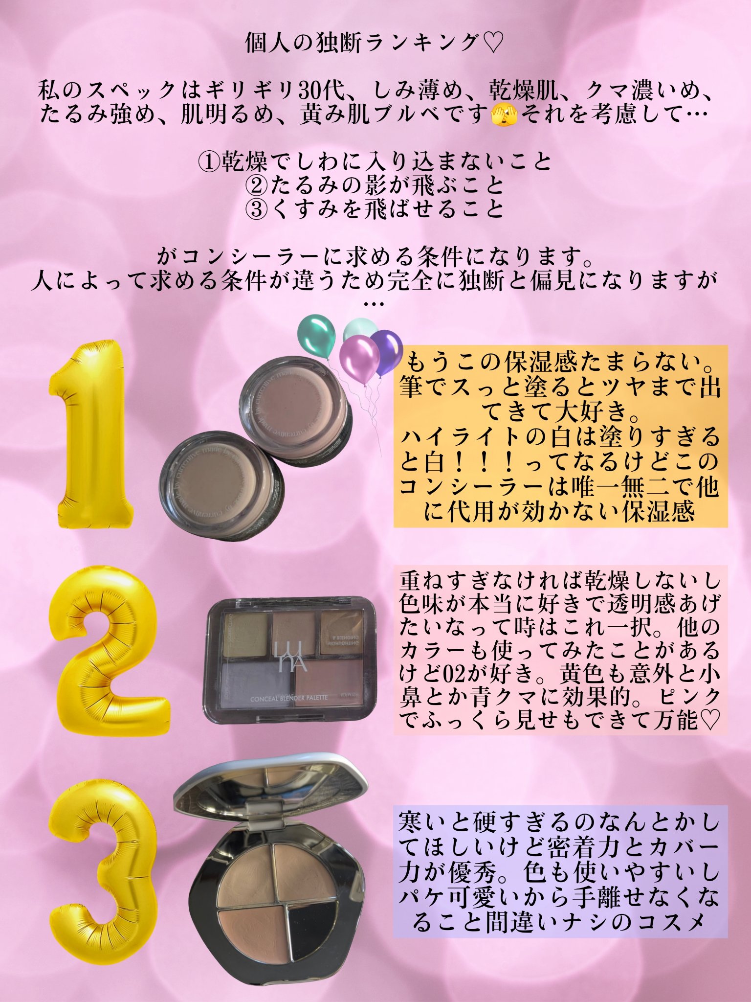 | コンシーラーランキング第24位 | バームタイプなのでスルッと溶けて指や筆にしっかりついて塗りやすい☺️しっとりだけど重くならないのが好きなポイント | 詳細を見る | |