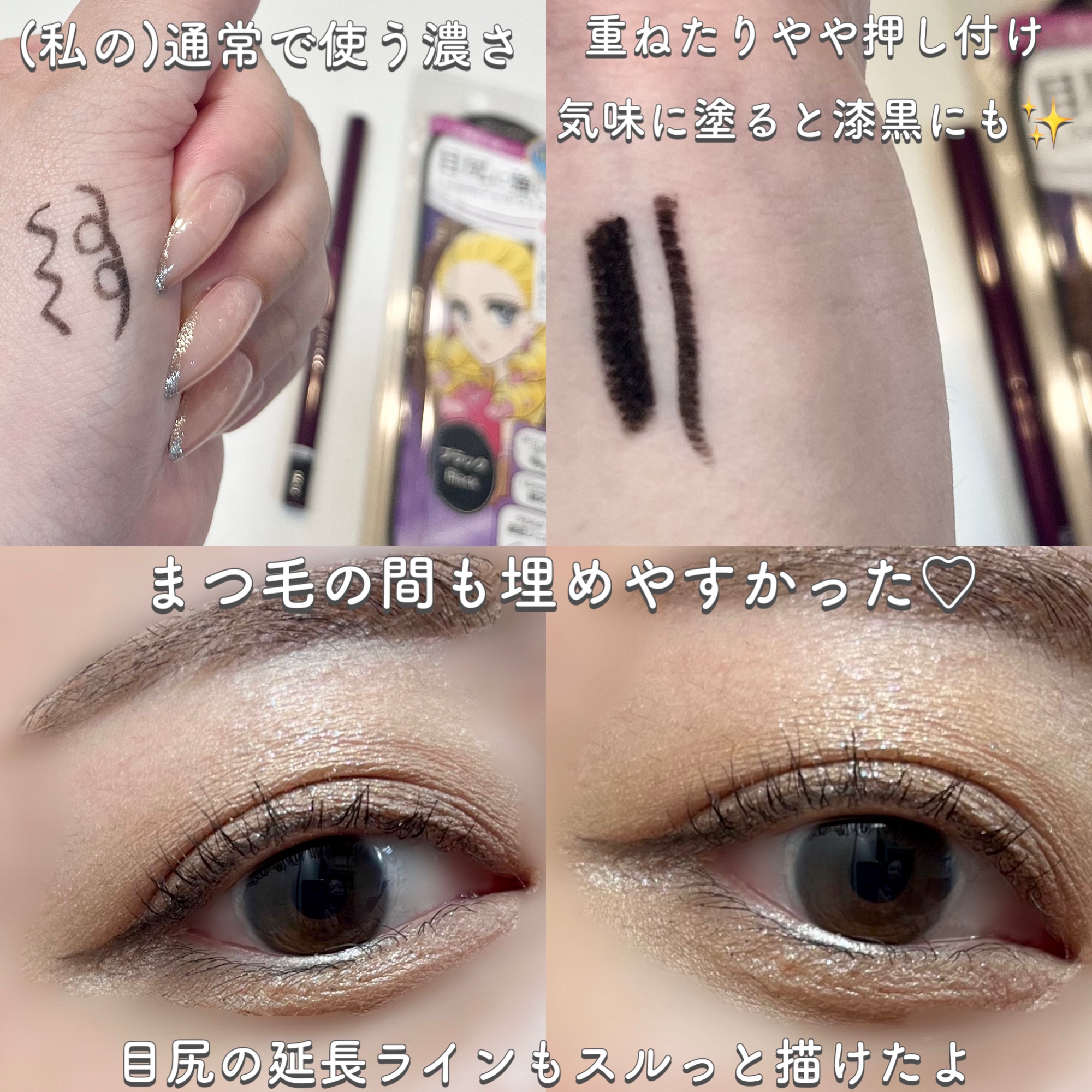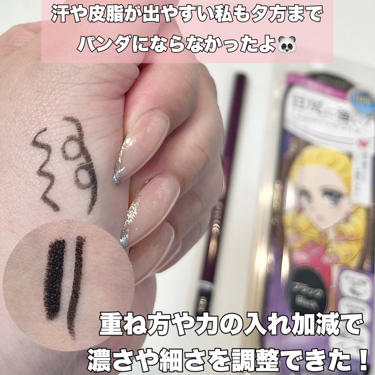 - ■速乾処方&ウォータープルーフ 涙・汗・水・皮脂・こすれに強い耐久処方でにじみを防ぎます。 ■もっと!なめらかに描きやすく、目尻に強いアイライナー 速乾性やウォータープルーフの性能は高いままに、スーパーガードポリマーNとスムースタッチWAXを配合。 従来品よりもさらになめらかさと描きやすさがパワーアップ。目尻まで美しいラインが描けます。 ■描きやすい1.5mmの細芯 やわらかなジェルタイプの細芯で、繊細なラインもスルスル簡単に描けます。 ■キレイなラインを長時間キープ! 12時間化粧持ちデータ取得済み※¹。 ※¹当社調べ。効果には個人差があります。 ■4種類の美容液成分配合 ヒアルロン酸・コラーゲン・パンテノール・カミツレエキス(うるおい成分)配合。 ■皮フ刺激テスト済み すべての方に皮フ刺激が起こらないというわけではありません。 ■染料不使用 染料不使用で肌に色素が残りません。
