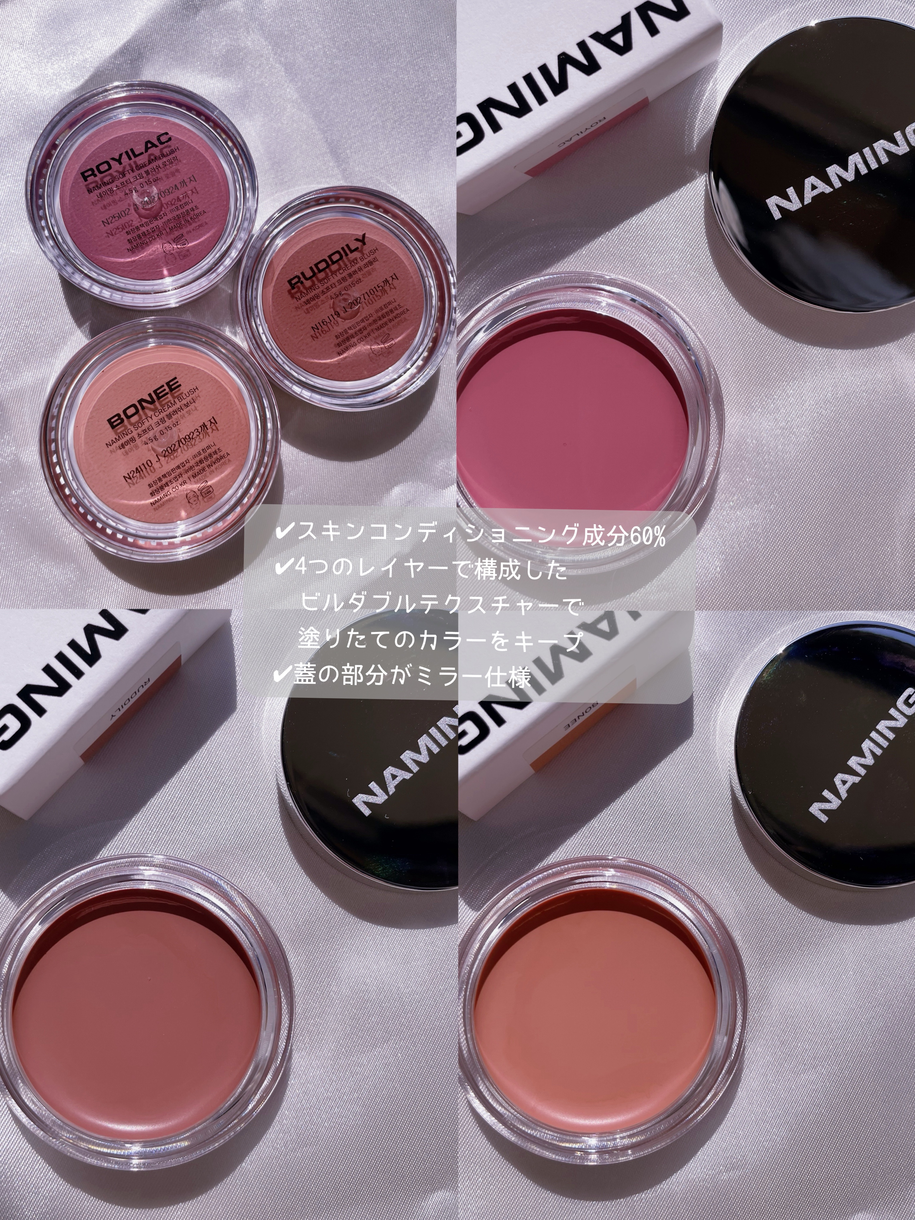 .naming様より、ご提供していただきました🫶ソフティークリームブラッシュ01アイシーピンクライラックROYILAC02ナチュラルヌーディーピンクRUDDILY03ソフトアプリコットBONEE体温でやわらかく溶けだし、肌の内側からじゅわっと...