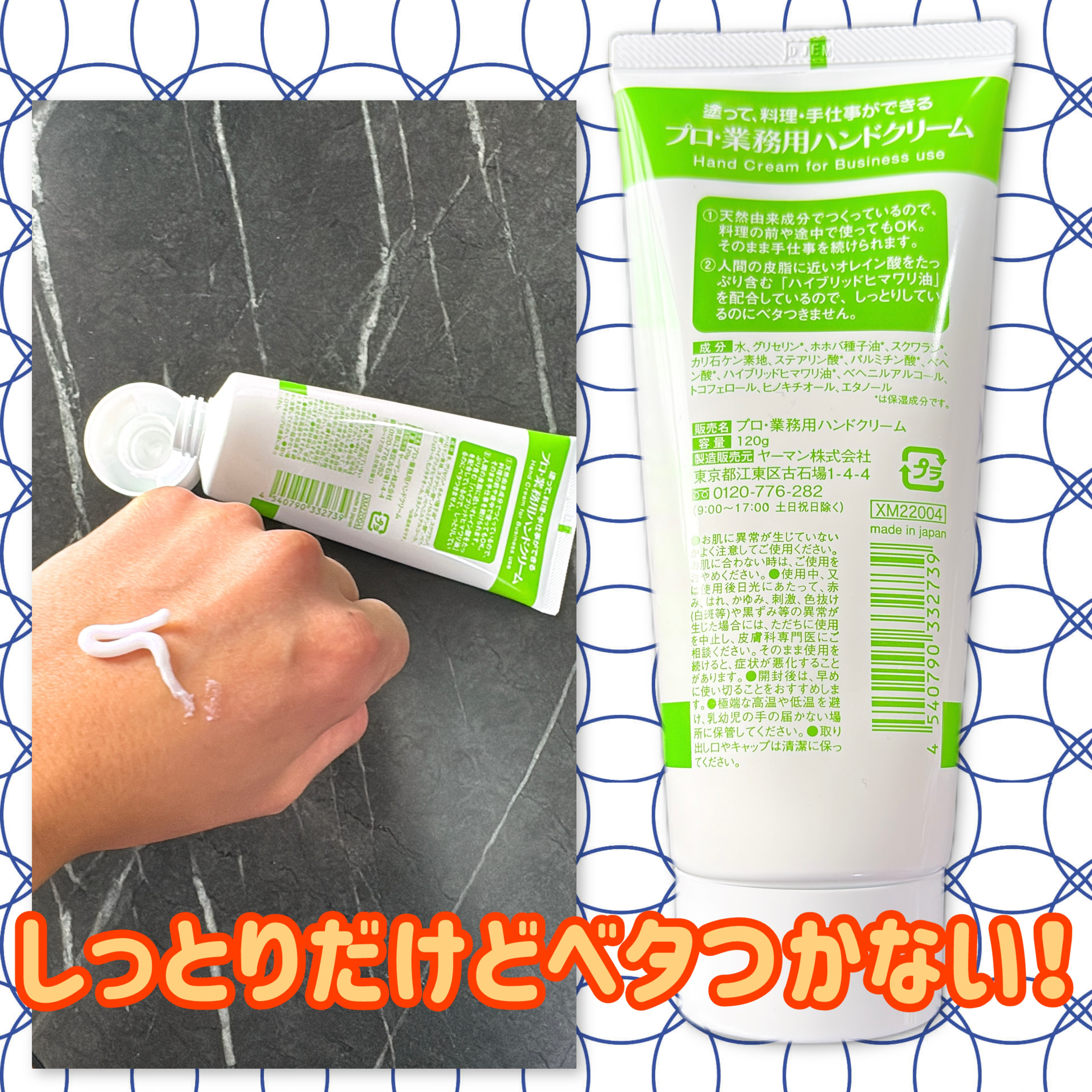 塗った直後からベタベタしない。 さらりとするのにしっとり保湿。 天然由来成分のみで出来ているので、そのまま食材に触っても大丈夫。 本っ当に手荒れしにくくなりました。 塗り直しも手間ではないと思えてしまいます。
