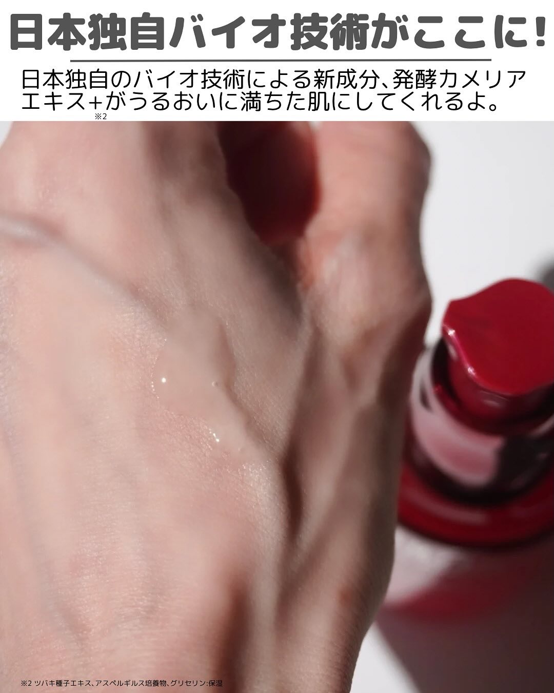 - 先進の美肌知見から。 365日、エイジングケア*¹する美容液。 今も未来も、本来持つ美しい肌へ。 日本独自のバイオ技術で椿の種子がもつ生命力からうるおいを。 発酵カメリアエキス+*²と厳選された美容成分を角層細胞へすみずみまで届けます。 朝、夜、毎日のお手入れで、ハリ、なめらかさ、透明感*³ あふれる輝きとうるおいに満ちた肌へ。 *¹ 年齢に応じたうるおいによるお手入れのこと *² ツバキ種子エキス、アスペルギルス培養物、グリセリン:保湿 *³ うるおいによる肌印象の事