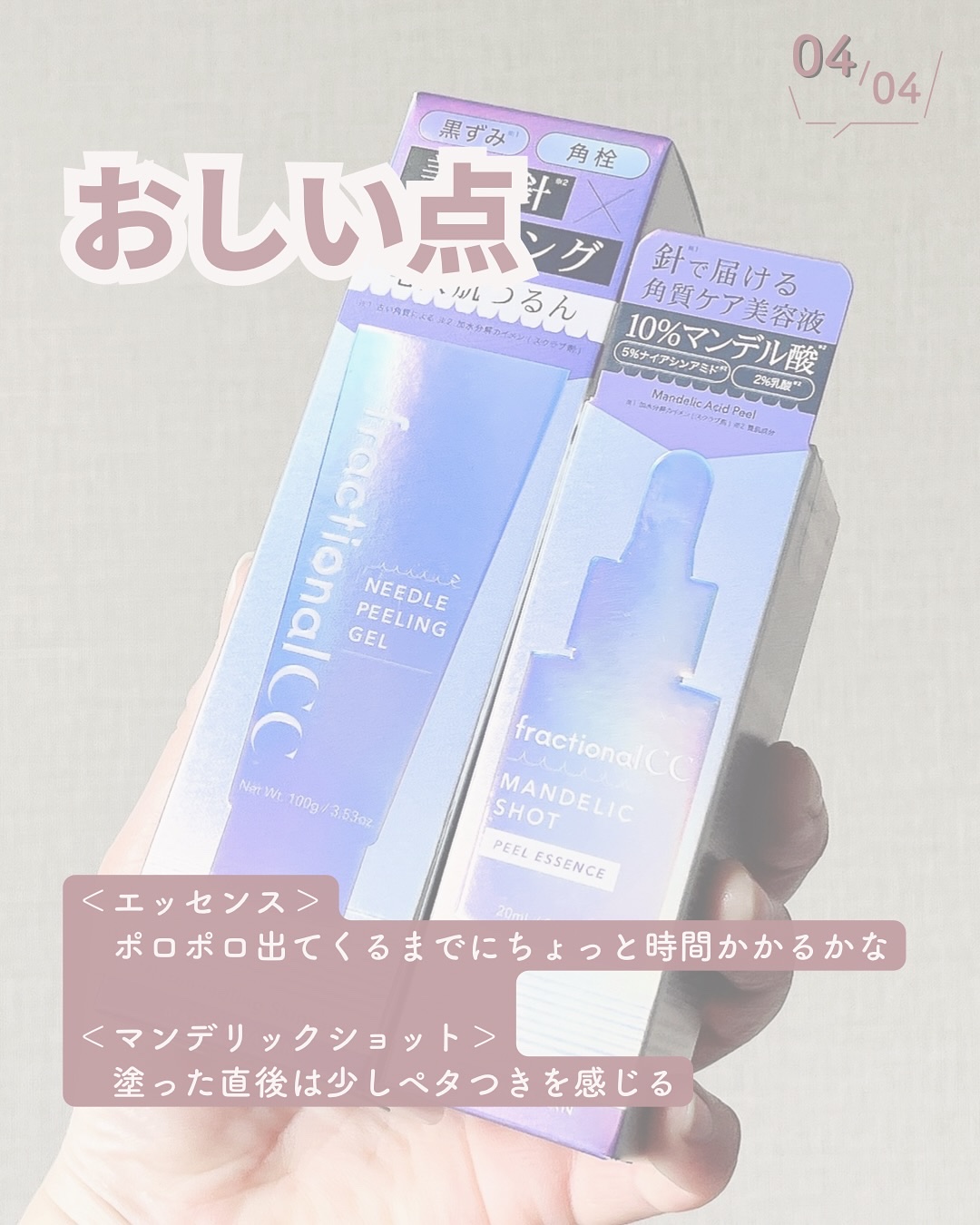 メイドインジャパンのダーマコスメ👏 フラクショナルCC ニードルピーリングジェル・マンデリックショット マンデル酸って初めて聞いたけどビターアーモンドから抽出される植物由来のAHA成分らしい! 刺激の低い角質ケア探してる人におすすめ! お肌のツルツル感✨