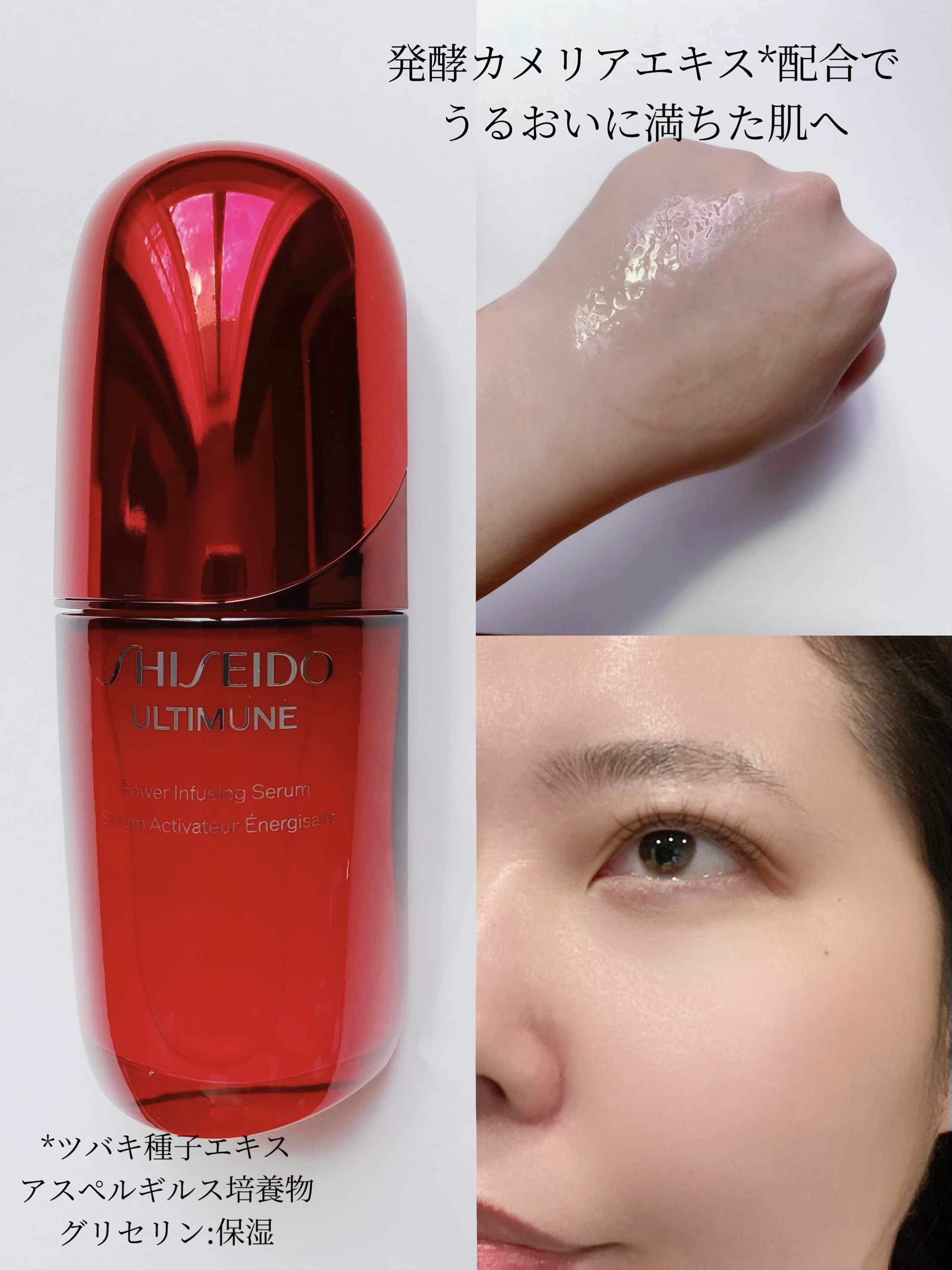 - 先進の美肌知見から。 365日、エイジングケア*¹する美容液。 今も未来も、本来持つ美しい肌へ。 日本独自のバイオ技術で椿の種子がもつ生命力からうるおいを。 発酵カメリアエキス+*²と厳選された美容成分を角層細胞へすみずみまで届けます。 朝、夜、毎日のお手入れで、ハリ、なめらかさ、透明感*³ あふれる輝きとうるおいに満ちた肌へ。 *¹ 年齢に応じたうるおいによるお手入れのこと *² ツバキ種子エキス、アスペルギルス培養物、グリセリン:保湿 *³ うるおいによる肌印象の事