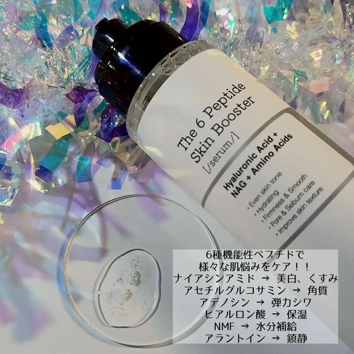 6種類のペプチドが与える💧✨ 様々な肌の悩みに寄り添うマルチペプチドフォーミュラ💫 手に取ると、みずみずしさを感じるテクスチャーで、すーっと馴染みやすく、しっとりとした使い心地🌸 6種のペプチド配合で、気になる弾力感ケアやトーンケア、整肌ケアの1つとして使いやすくGreat👍💎