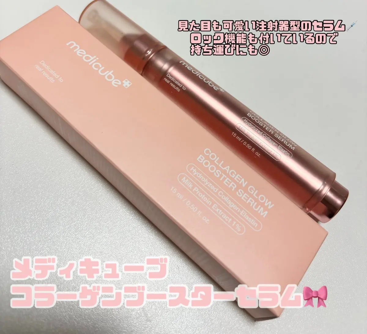 コラーゲンブースターセラム⋆⋆コラーゲンブースターセラム注射器のような形だよ!1回分をカチッと出来るので出しすぎ防止になって嬉しいなと思ったよ◎手のひらの長さと同じくらいでスティック型なので持ち運びに便利◎回すことでロックもできるよ乳白色の少...