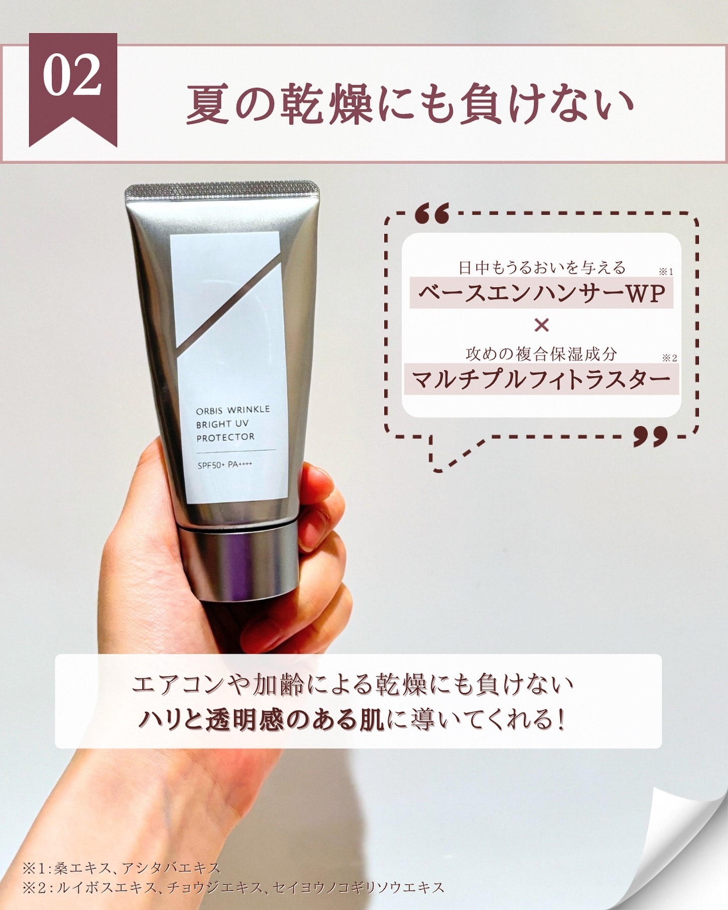 - 【医薬部外品】 オルビスのシワ改善・美白(*1)を叶えるスキンケア「リンクルシリーズ」。 2023年2月、大人気の高機能日焼け止めが攻めと守りを強化してリニューアル!あなたらしく輝く未来のために、太陽の下の新しいエイジングケア(*2)をご提案します。 特筆すべきは、外的刺激から肌を守る5つの成分・処方技術です。 ①排気ガスなどに含まれる有害なガス(*3)を分解し、その過程で発生するイオンでプロテクト膜を強固にする成分(*4) ②汗でプロテクト膜が強固になる処方 ③大気中のちり・ホコリ、花粉を遮断する成分 ④ブルーライト、 ⑤近赤外線をそれぞれカットする粉体(*5) を採用しました。 さらにオルビス独自の攻めの研究に基づく成分「マルチプルフィトラスター(*6)」もプラス。 イキイキとした印象の輝くようなハリと、潤って透明感のある肌をサポートします。 有効成分「Wナイアシン(*7)」も変わらず配合し、日焼け止めでありながら、シワ改善も美白(*1)も叶えます。 SPF50+/PA++++の最高峰(*8)の紫外線カット力を持ちながらも、きしみにくく白浮きもしにくい。保湿クリーム級のここちよさを実現しました。 UVケアとエイジングケア(*2)を両立して、外的刺激からもガードする、オルビス最高峰(*8)“攻めと守り”の日焼け止めです。 *1 メラニンの生成を抑え、シミ・ソバカスを防ぐ *2 年齢に応じたお手入れのこと *3 アセトアルデヒド *4 酸化チタン-PE (酸化チタン)とイオン応答粉体(シリル化処理無水ケイ酸)を組み合わせた成分 *5 酸化チタン *6 イキイキとした印象の輝くようなハリと潤って透明感のある肌をサポートする複合保湿成分 *7 ナイアシンアミド *8 オルビス内最高の紫外線カットレベル