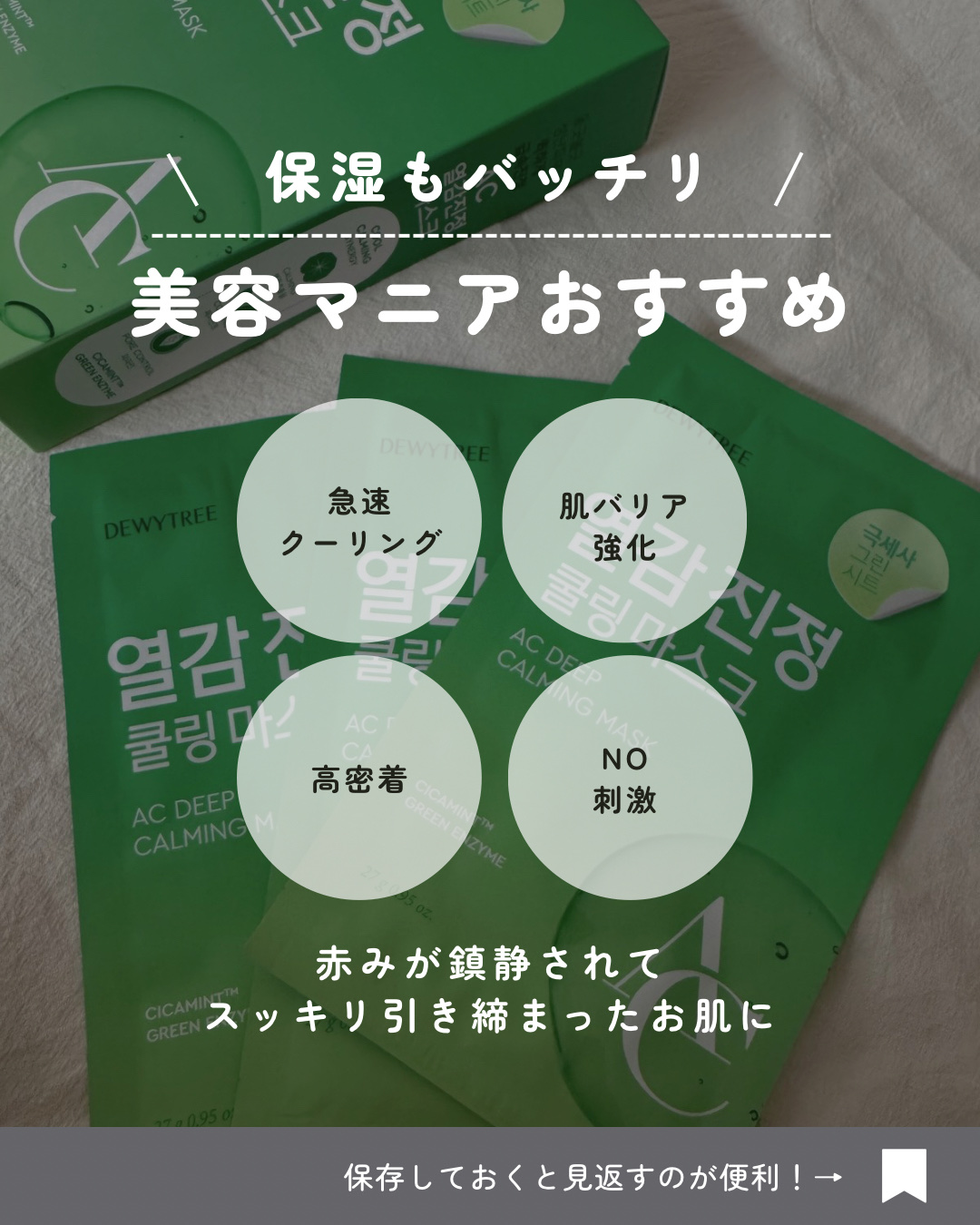 @dewytree_japan❤︎DEWYTREEACディープ熱感カーミングマスク10枚入り¥3,000(税込)※現時点でのQoo10価格ほてり感ををほどよく抑え、刺激を素早く鎮めて透明感のあるしっとりしたお肌に仕上げるデューイーツリーACラ...