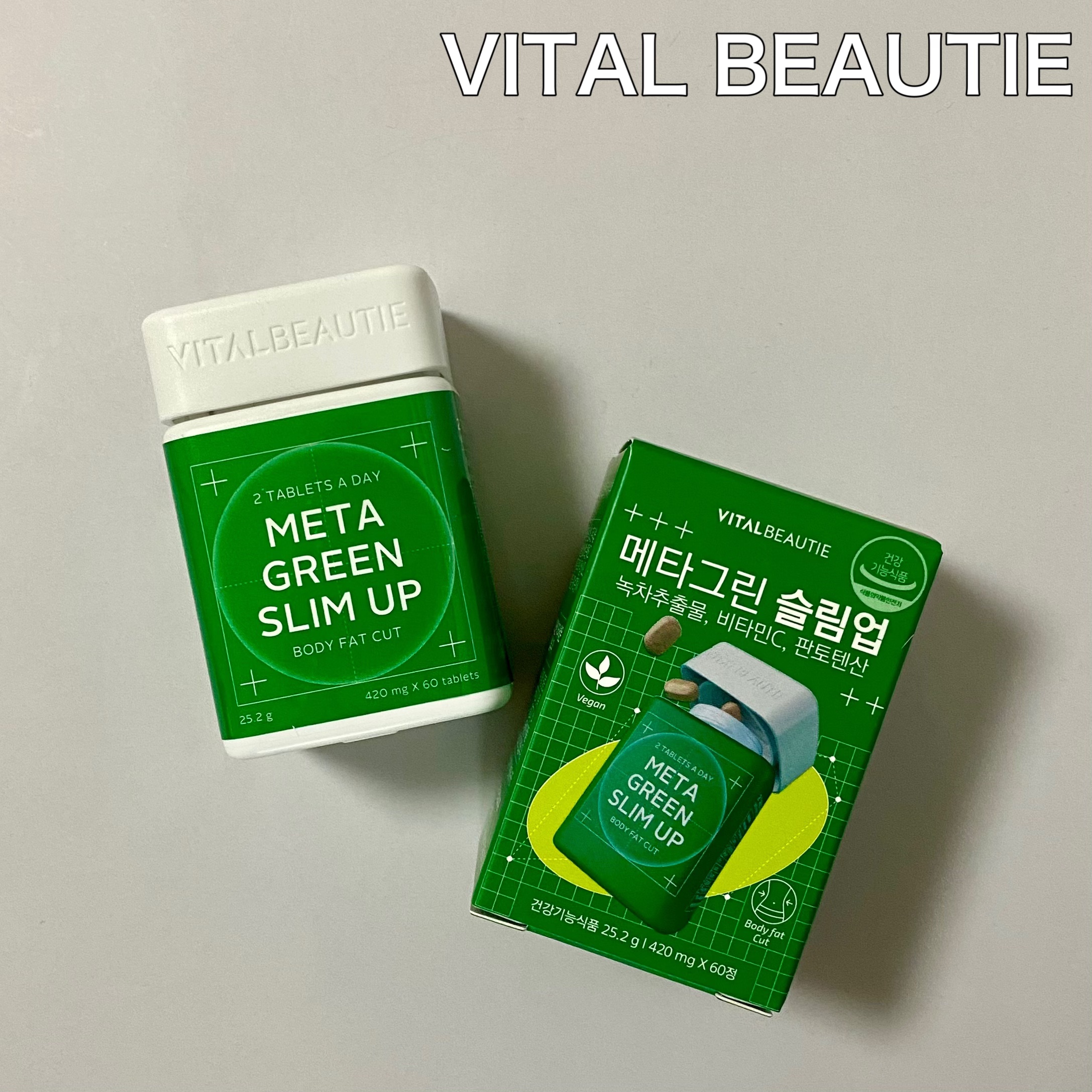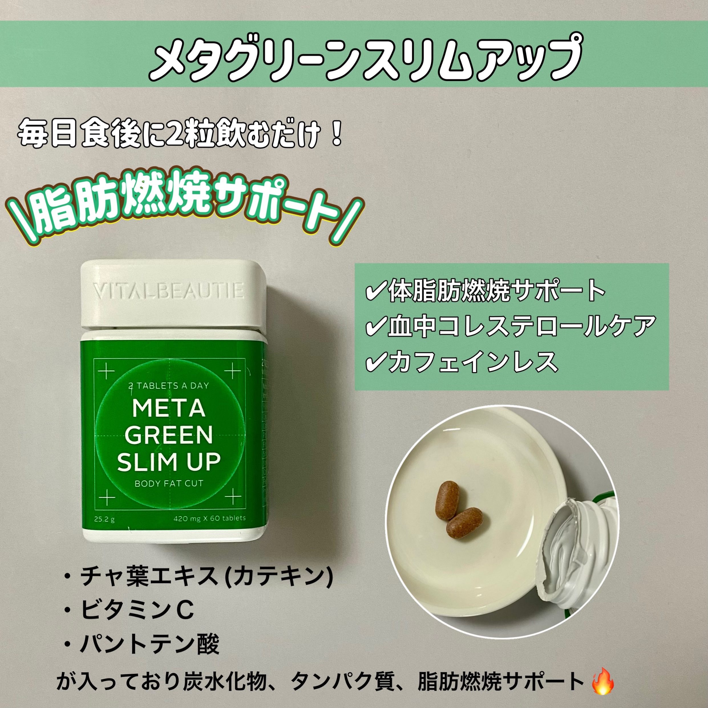 #VITALBEAUTIEバイタルビューティーメタグリーンスリムアップ30粒入り☑︎チャ葉エキス(カテキン)体脂肪CUT、血中コレステロール改善☑︎パントテン酸炭水化物・タンパク質・脂肪食物代謝をUP☑︎ビタミンC抗酸化ケア1日2粒飲むだけ💊...