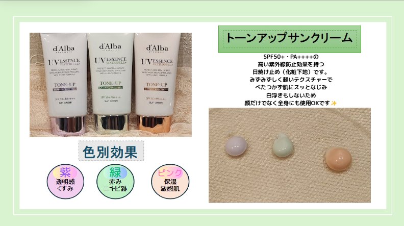 人気のシリーズから新しく出た待望のグリーンカラー💚 肌の赤みが抑えられてツヤも出ていい感じでした✨ 私は頬が赤いので前にいただいたパープルが赤みが消えるからよく使ってたけどグリーンの方がより赤みなくなった💕 でも香りはピンクとパープルの方が好き🥰