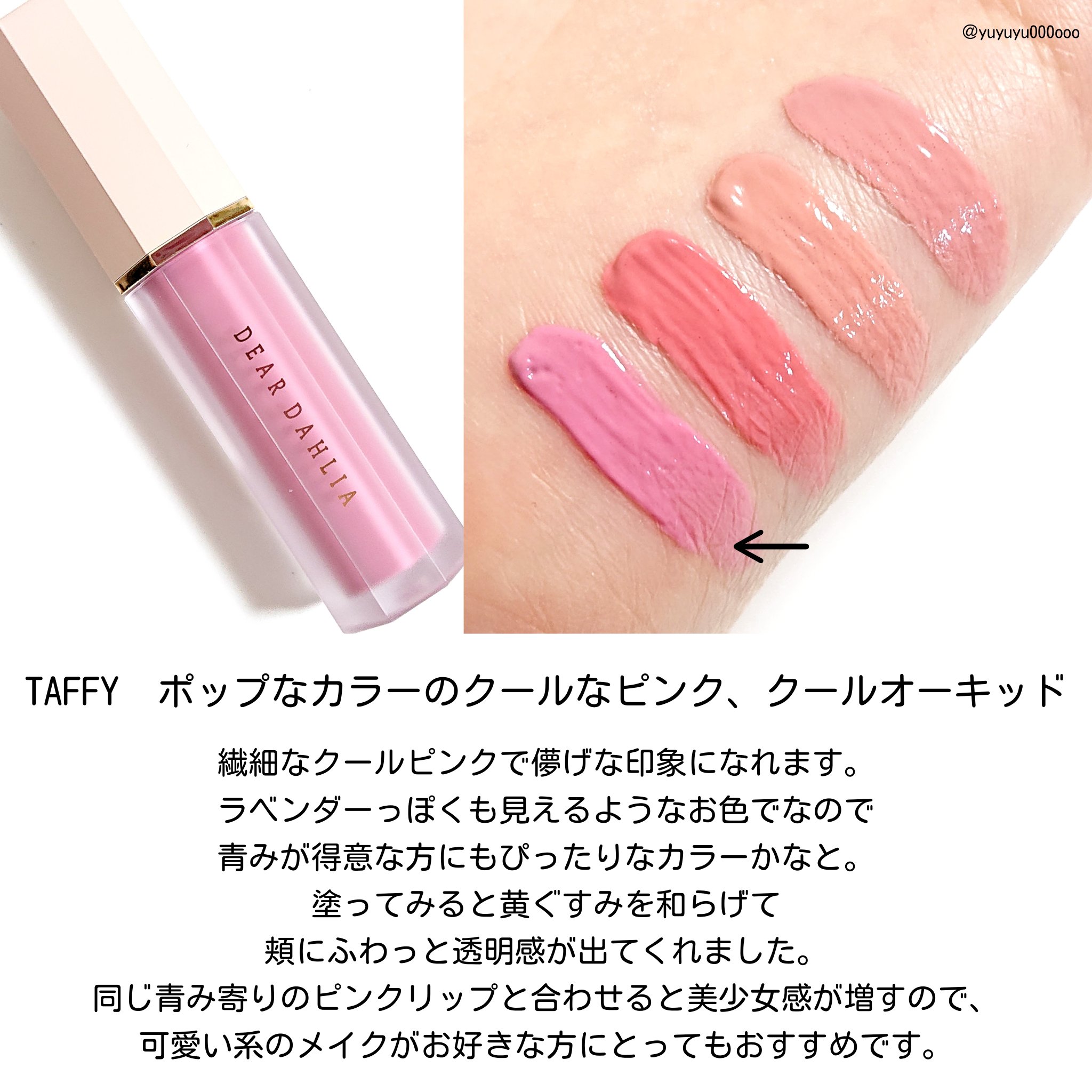 - ・花びらのような血色感をもたらすウォーターリキッドブラッシャー ・ウォータリーテクスチャーでツヤ感を出しながらナチュラルにレイヤリングが可能 ・持ち運びが便利でいつでも血色感をプラスできる ・チーク初心者でもナチュラルに発色するので安心! ・ダリア花抽出エキスのスキンコンディショニング作用によってお肌をケアしながらメイク可能。 ブルベオススメカラー/BARELY×TAFFY イエベオススメカラー/BARELY×DREAMY