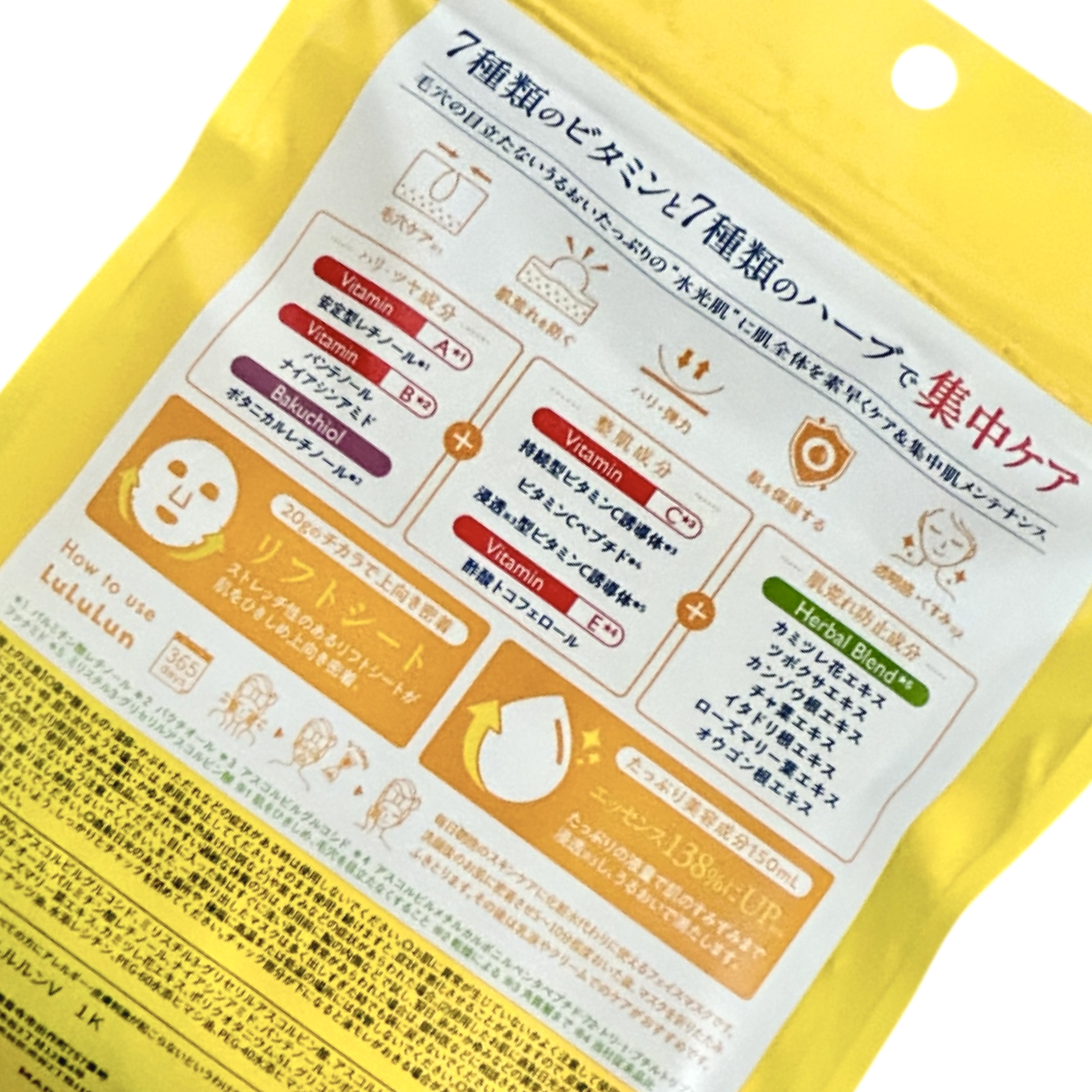 - ルルルンからビタミンたっぷりの化粧水フェイスマスクが新登場。 7種類のビタミン※1と7種類のハーブ※1で肌全体を素早くケア&集中肌メンテナンス。 新開発のフェイスラインに密着するシートで肌を引き締めながら肌のすみずみ※2までうるおいで満たし、毛穴の目立たないうるおいたっぷりの“水光肌”へ。 (※1 全て保湿成分として ※2 角質層まで)