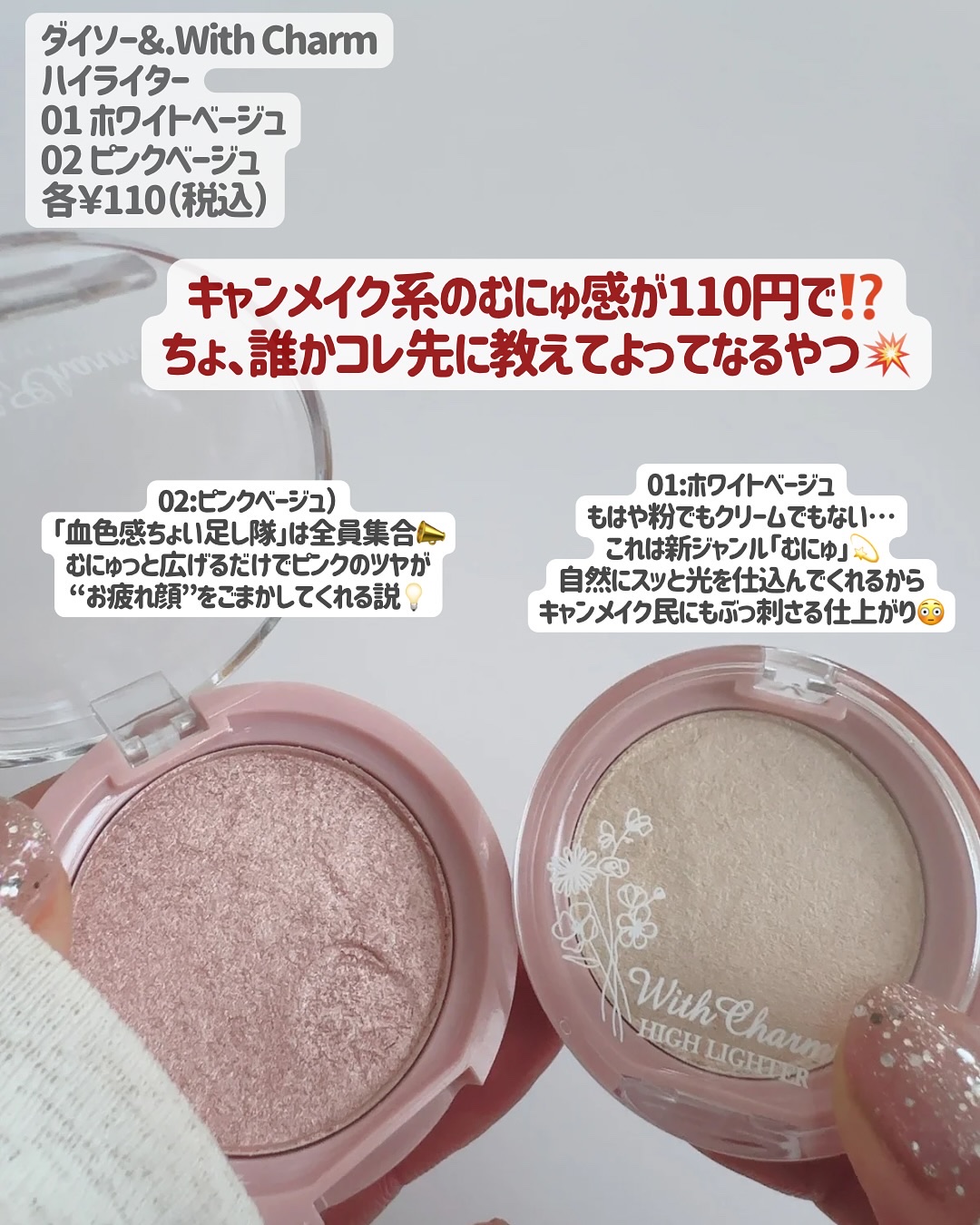 ダイソー新作!&.WithCharmレア感覚ハイライターピンクベージュ☑︎¥110☑︎塗った瞬間サラサラ☑︎たっぷりパール感むにゅっ感覚が楽しいハイライター。110円で手に入るので気になる方はダイソーへGO!#ダイソーコスメ#ダイソー#ダイソ...