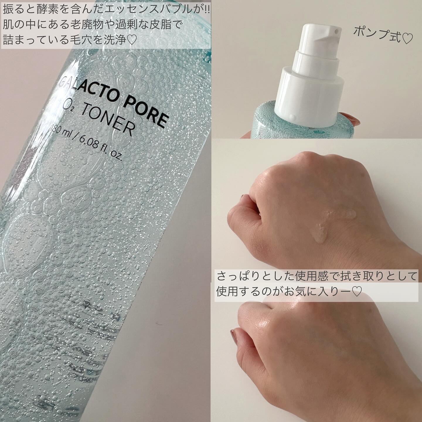- ガラクトシリーズより新しく登場したガラクトポアオーツー(O2)トナー。 新感覚の酸素を含んだバブルエッセンスが毛穴に詰まった古い角質や過剰な皮脂をケアして肌のキメを整え、イキイキとした肌印象に導きます。 敏感なお肌にもやさしい使い心地で毛穴ケアが可能です。 しっとりべたつきのないテクスチャーで朝晩使用でき、さらに乾燥による毛穴目立ちを防ぐため肌表面に潤いを与えます。 皮膚低刺激テスト完了済*。敏感肌の方もご使用いただけます。 <特長成分> ガラクトミセス発酵ろ過物 : 肌にやさしい使い心地でうるおいを与える。(保湿成分) ウィッチヘーゼル : 肌を引き締めなめらかな印象をサポート。(整肌成分) PHA : 角質ケア成分配合。(角質柔軟成分) <テクスチャー&香り> - テクスチャー しっとり伸びやすく肌になじみやすいテクスチャー - 香り シトラスハーブ系 *全ての方に皮膚刺激が発生しないということではありません