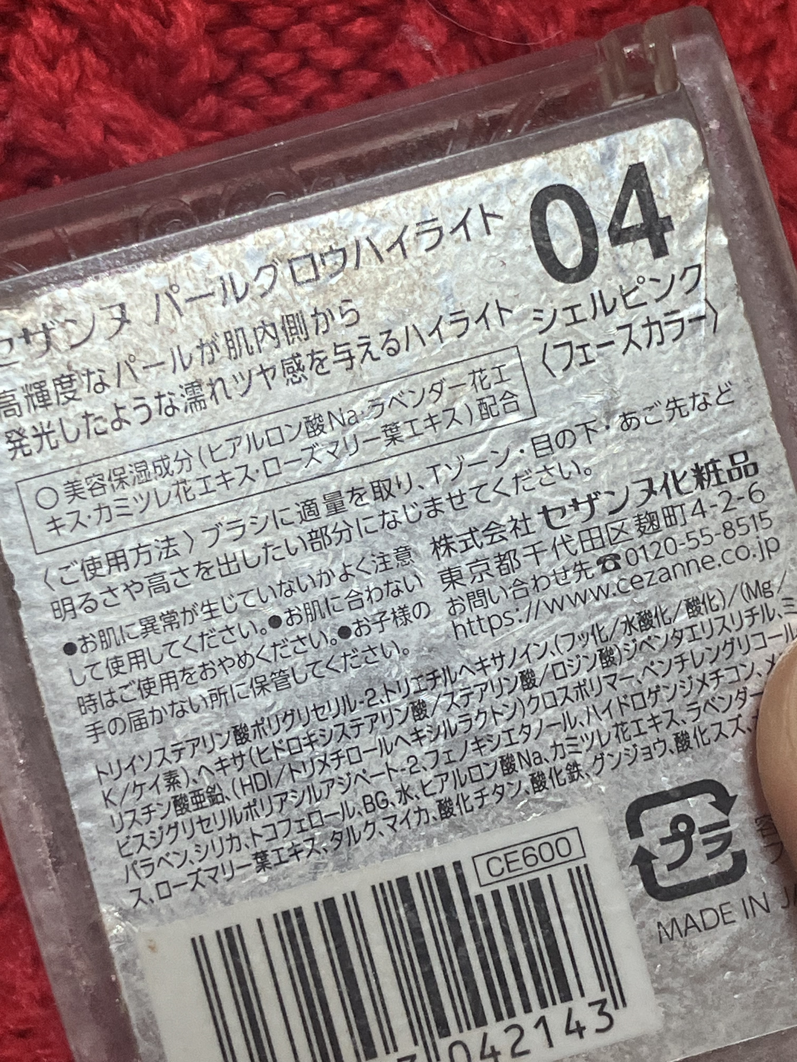 - <01 シャンパンベージュ> トリイソステアリン酸ポリグリセリル-2、トリエチルヘキサノイン、(フッ化/水酸化/酸化)/(Mg/K/ケイ素)、ヘキサ(ヒドロキシステアリン酸/ステアリン酸/ロジン酸)ジペンタエリスリチル、ミリスチン酸亜鉛、(HDI/トリメチロールヘキシルラクトン)クロスポリマー、ペンチレングリコール、ビスジグリセリルポリアシルアジペート-2、フェノキシエタノール、ハイドロゲンジメチコン、メチルパラベン、シリカ、トコフェロール、BG、水、ヒアルロン酸Na、カミツレ花エキス、ラベンダー花エキス、ローズマリー葉エキス、タルク、マイカ、酸化チタン、酸化鉄、酸化スズ、水酸化Al <02 ロゼベージュ> トリイソステアリン酸ポリグリセリル-2、トリエチルヘキサノイン、(フッ化/水酸化/酸化)/(Mg/K/ケイ素)、ヘキサ(ヒドロキシステアリン酸/ステアリン酸/ロジン酸)ジペンタエリスリチル、ミリスチン酸亜鉛、(HDI/トリメチロールヘキシルラクトン)クロスポリマー、ペンチレングリコール、ビスジグリセリルポリアシルアジペート-2、フェノキシエタノール、ハイドロゲンジメチコン、メチルパラベン、シリカ、トコフェロール、BG、水、ヒアルロン酸Na、カミツレ花エキス、ラベンダー花エキス、ローズマリー葉エキス、タルク、マイカ、酸化チタン、酸化鉄、酸化スズ、水酸化Al <03 オーロラミント> トリイソステアリン酸ポリグリセリル-2、トリエチルヘキサノイン、(フッ化/水酸化/酸化)/(Mg/K/ケイ素)、ヘキサ(ヒドロキシステアリン酸/ステアリン酸/ロジン酸)ジペンタエリスリチル、ミリスチン酸亜鉛、(HDI/トリメチロールヘキシルラクトン)クロスポリマー、ペンチレングリコール、ビスジグリセリルポリアシルアジペート-2、フェノキシエタノール、ハイドロゲンジメチコン、メチルパラベン、シリカ、トコフェロール、BG、水、ヒアルロン酸Na、カミツレ花エキス、ラベンダー花エキス、ローズマリー葉エキス、タルク、マイカ、酸化チタン、合成フルオロフロゴパイト、酸化鉄、酸化スズ、グンジョウ、水酸化Al <04 シェルピンク> トリイソステアリン酸ポリグリセリル-2、トリエチルヘキサノイン、(フッ化/水酸化/酸化)/(Mg/K/ケイ素)、ヘキサ(ヒドロキシステアリン酸/ステアリン酸/ロジン酸)ジペンタエリスリチル、ミリスチン酸亜鉛、(HDI/トリメチロールヘキシルラクトン)クロスポリマー、ペンチレングリコール、ビスジグリセリルポリアシルアジペート-2、フェノキシエタノール、ハイドロゲンジメチコン、メチルパラベン、シリカ、トコフェロール、BG、水、ヒアルロン酸Na、カミツレ花エキス、ラベンダー花エキス、ローズマリー葉エキス、タルク、マイカ、酸化チタン、酸化鉄、グンジョウ、酸化スズ、水酸化Al