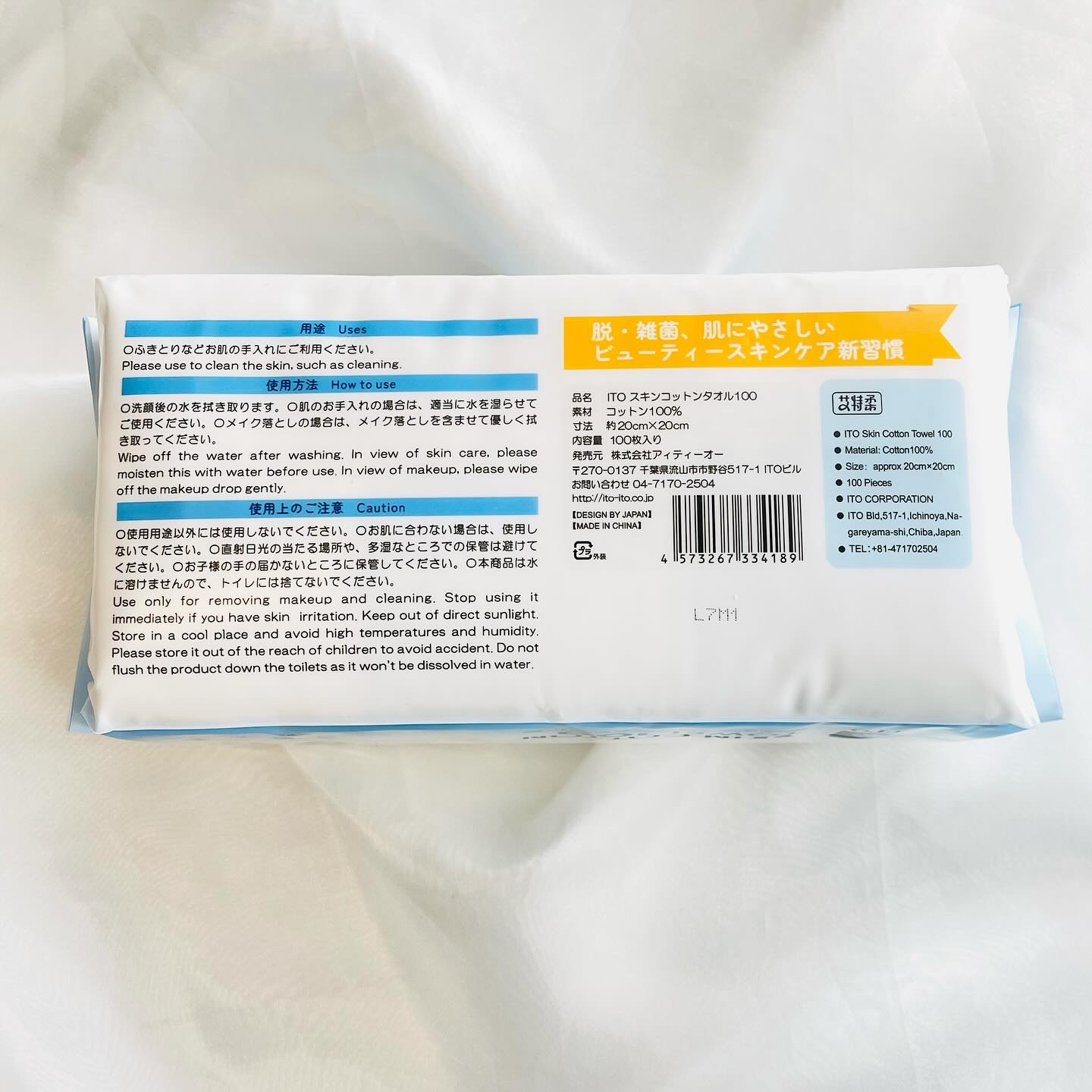 ITOスキンコットンタオル100 100枚入コットン100%の肌当たりの優しい生地の使い捨てタイプのフェイスタオルITOのフェイスタオル大好きで愛用しているけど、こちらの種類は初めて!毛羽立ちの少ないコットンタオルで厚みは普通くらいで肌当たり...