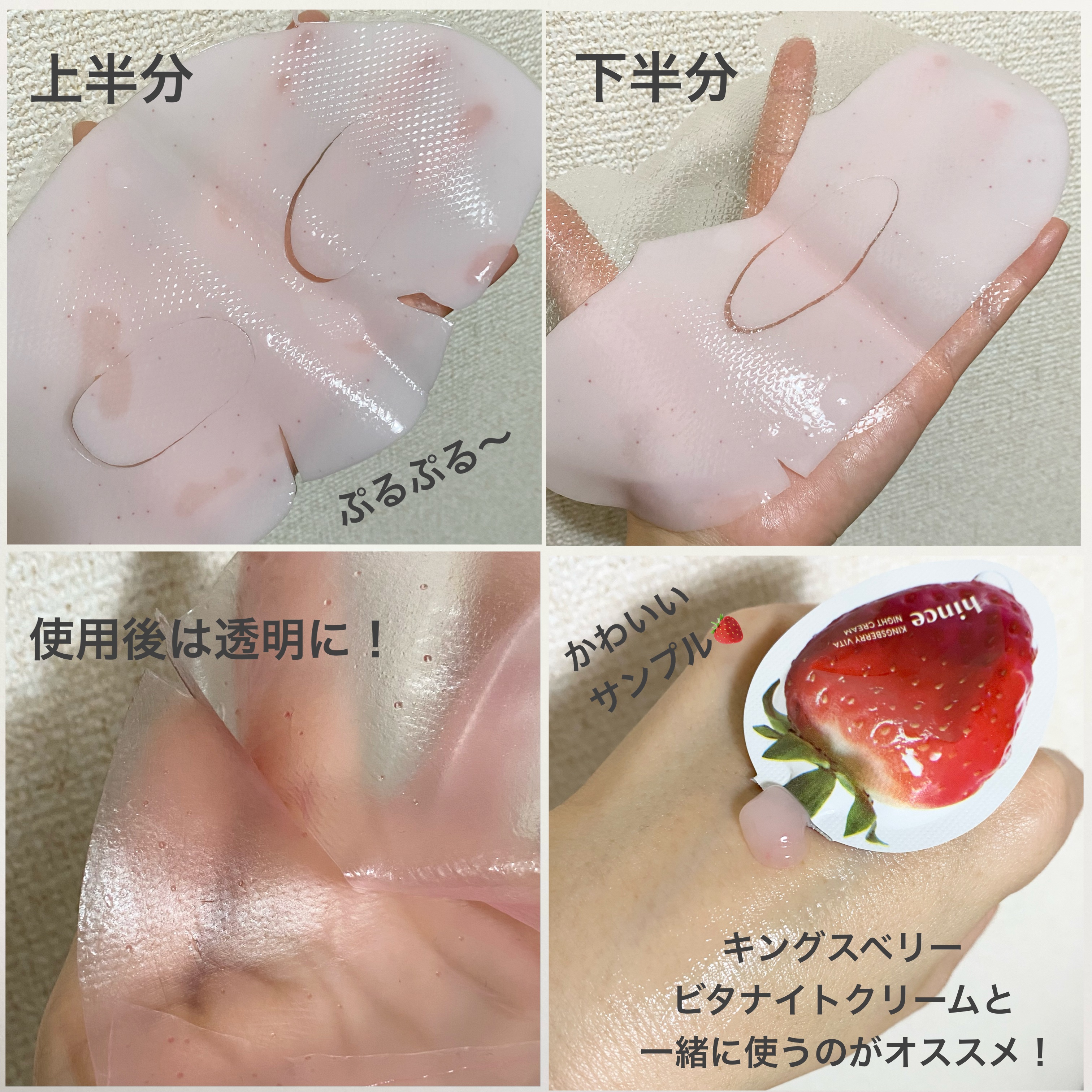hinceの新商品、KINGSBERRYVITACOLLAGENMASKキングスベリービタコラーゲンマスクをお試しさせていただきました。普通のスキンケアをした後にマスクをつけます。一緒にいただいたキングスベリービタナイトクリームはぷるんと柔ら...